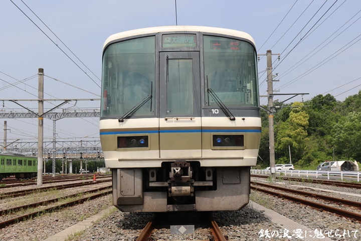 | 5月16日(水)に行われた鉄道友の会阪神支部によるJR西日本 221系撮影会。221系は平成元年にデビュー、翌年には鉄道友の会ローレル賞を受賞しました。まずは奈良方から撮影。前照灯が青色にともっています。 |