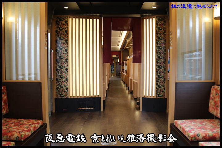 | 今年3月21日(木・祝)に行われた鉄道友の会阪神支部、そして阪急電鉄鉄道ファンクラブによる阪急電鉄 京とれいん雅洛撮影会。京とれいん雅楽は7000系を改造し2本目の京とれいんとして3月23日(土)より運行開始。6両編成の1両ごとに季節を定め、全ての車両の外観や車内デザインが異なっています。まずは梅田方1号車の車内を撮影しました。テーマは「季節:秋、植物:楓」、紅葉文様を代表する図柄「流水に楓」を用いた秋の京都を感じる車両です。 |