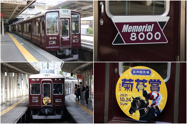 | そして西宮北口駅へ、コウペンちゃんラッピング、Memorial8000、そして菊花賞ヘッドマークと次々とやって来ました。 |