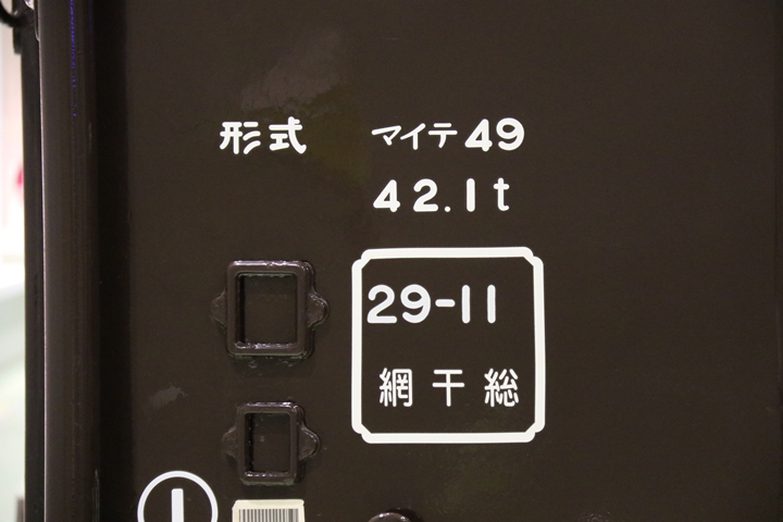 | マイテ49形2号車は昭和13年にスイテ37041として特急「富士」用に新造、唯一の丸屋根の展望車で昭和39年に廃車後に交通科学館で保存、のちに車籍復活しました。続いて京都方からマイテ49形2号車の正面を撮影。 |