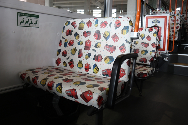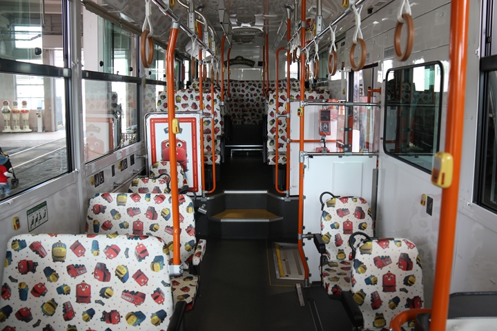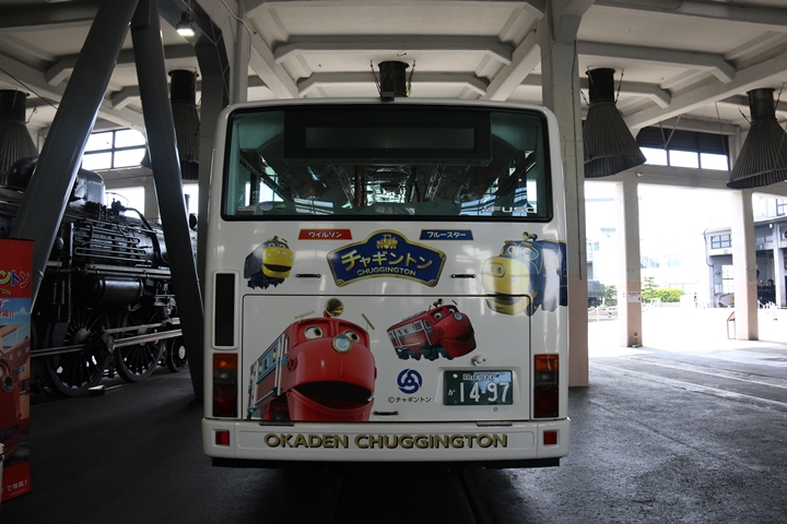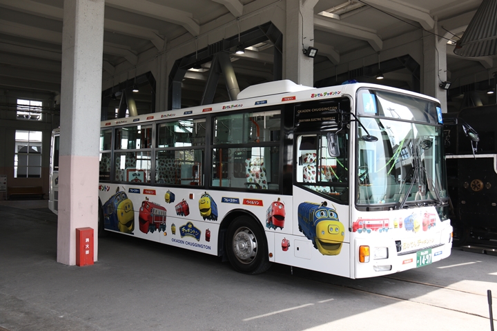 | そしてこの日のもう一つの目的は4月13日(土)から4月21日(日)まで扇形車庫に特別展示されている「おかでんチャギントンバス」を撮影するため。11時からのイベント終了後に無人状態になってから撮影しました。 |