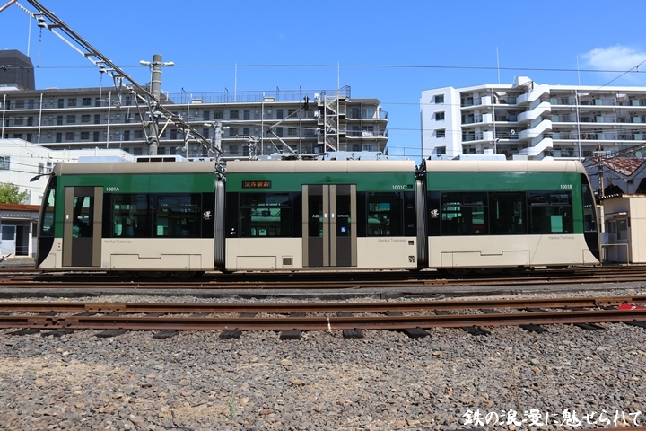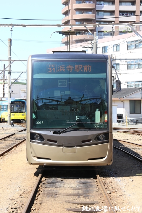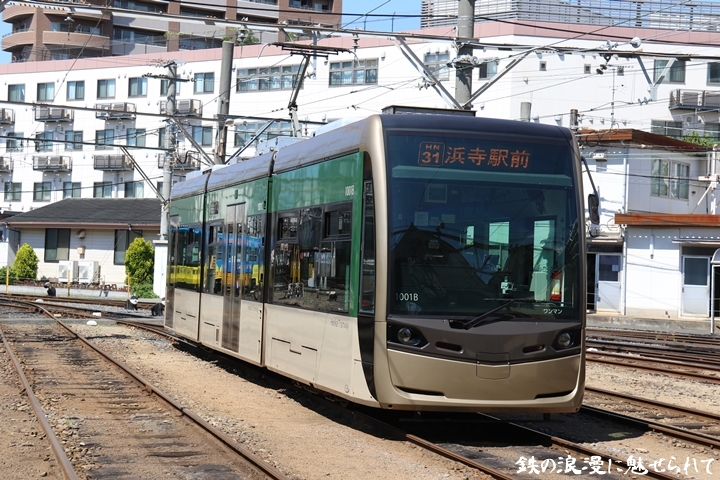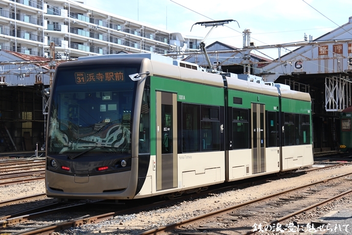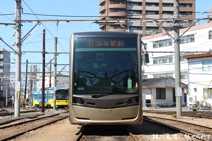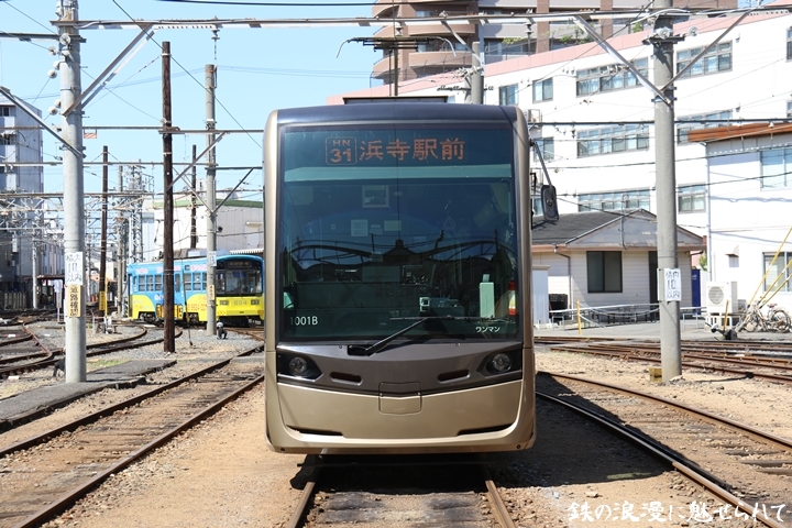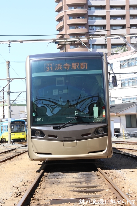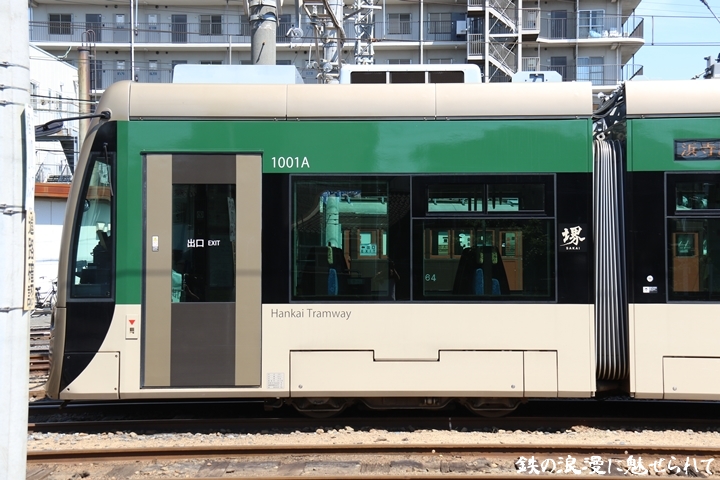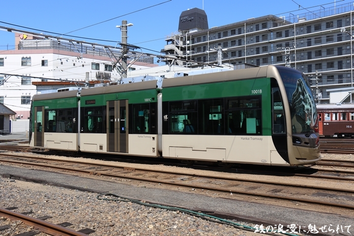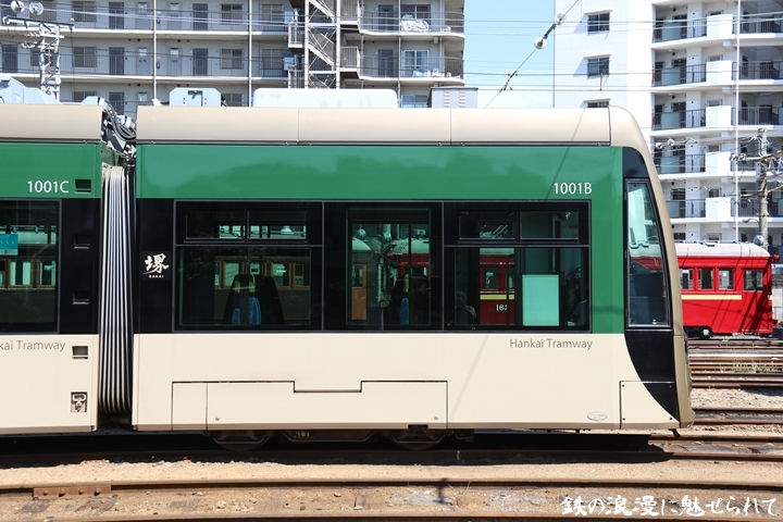 | そして受付を済ませ我孫子道車庫へ向かいます。実はこの日、鉄道友の会 車両記録研究会によるモ161形他撮影会があり私も行ってきました。鉄道友の会 車両記録研究会の行事に参加するのは初めてでその内容にも興味津々でした。なお今回は四回に分けて一気に御紹介しようと思います。まずは1001号「茶ちゃ」を撮影します。茶ちゃは平成25年8月25日より運行開始、阪堺電気軌道では初の超低床型車両であり車両の愛称は「堺トラム」、第1編成の1001号の編成呼称は「茶ちゃ」と呼ばれ平成29年度グッドデザイン賞を受賞しました。まずは外観を撮影。 |