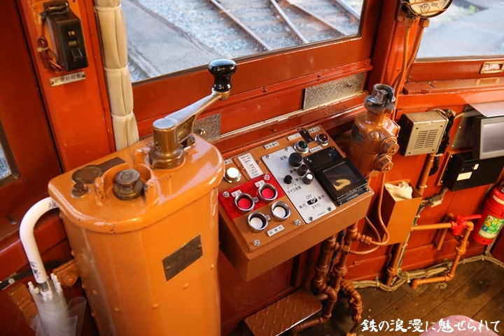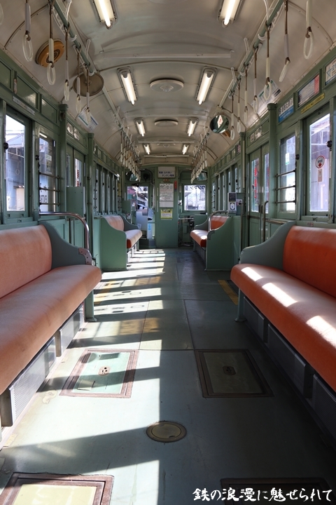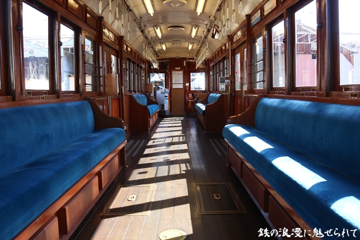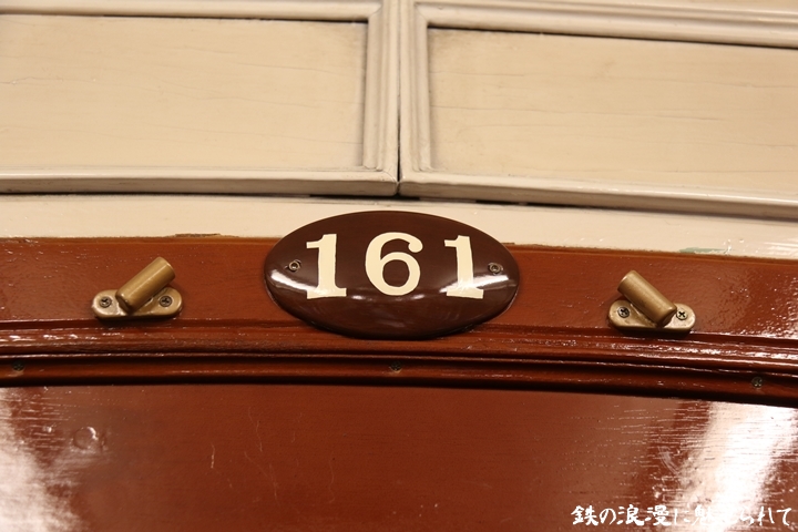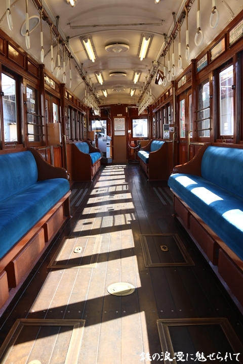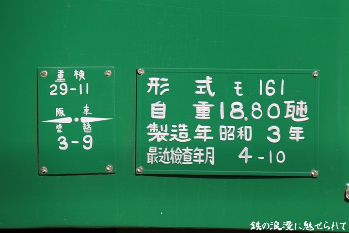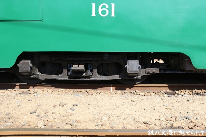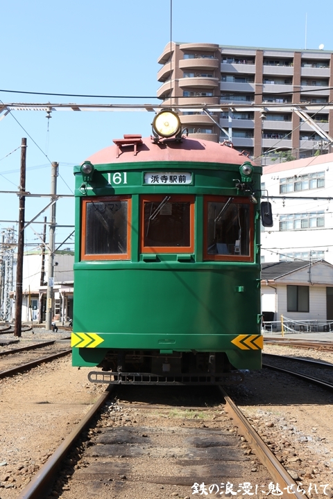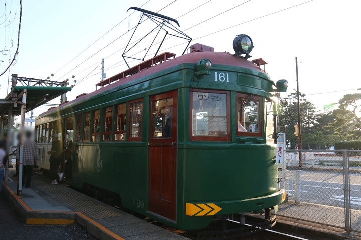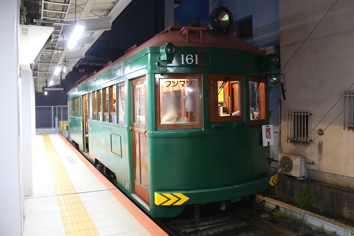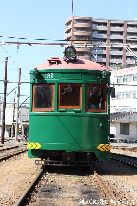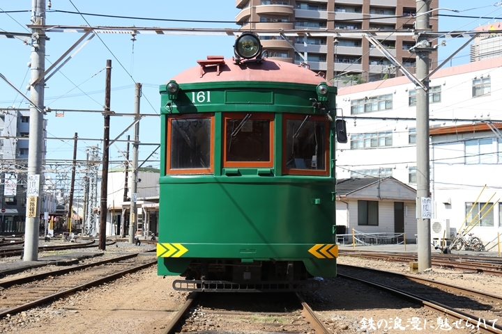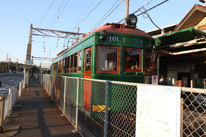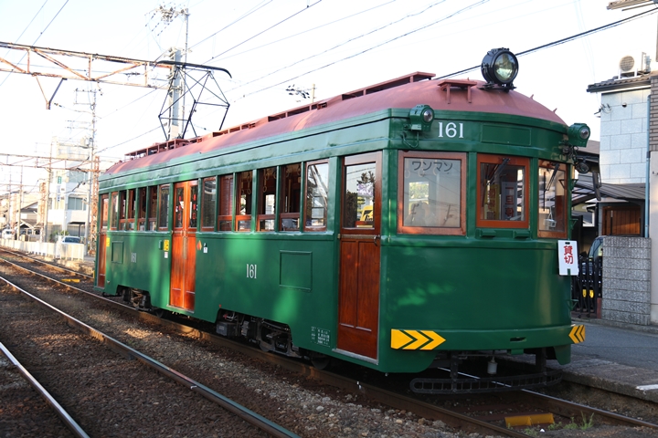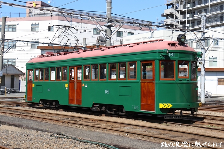 | 続いてモ161号車を撮影します。モ161形は昭和3年/1928年に新造、現役稼働年数が90年を越え日本で定期運用されている電車としては日本最古であります。中でもモ161号車は平成23年、阪堺電気軌道開業100周年を記念し昭和40年/1965年当時の状態に復元されました。まずは外観を撮影。 |