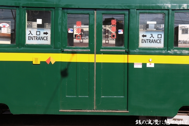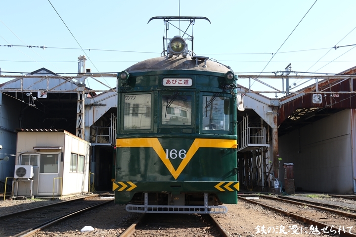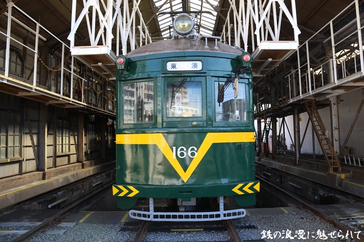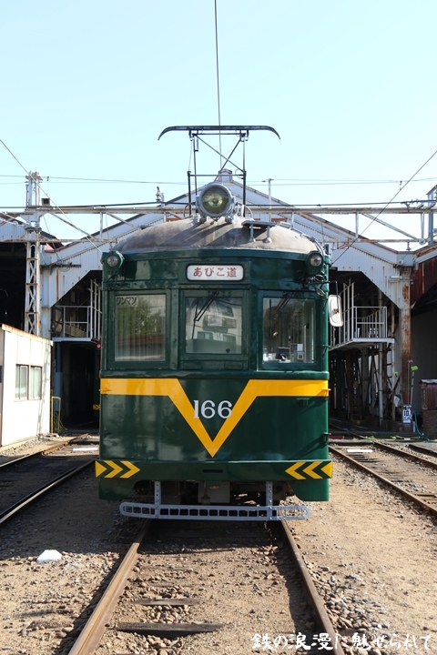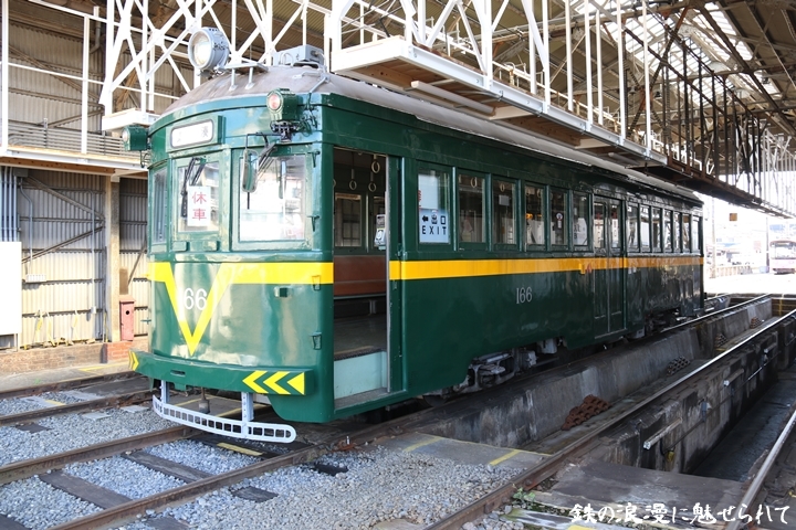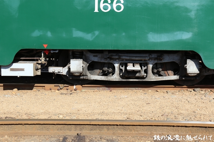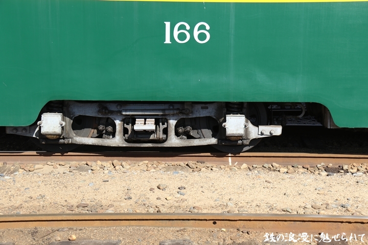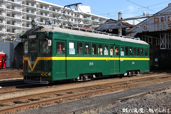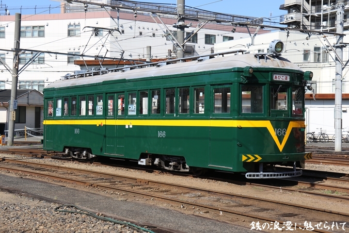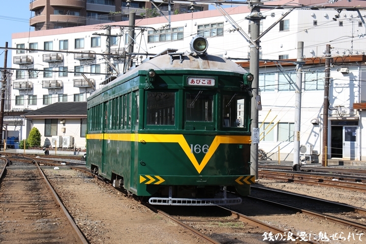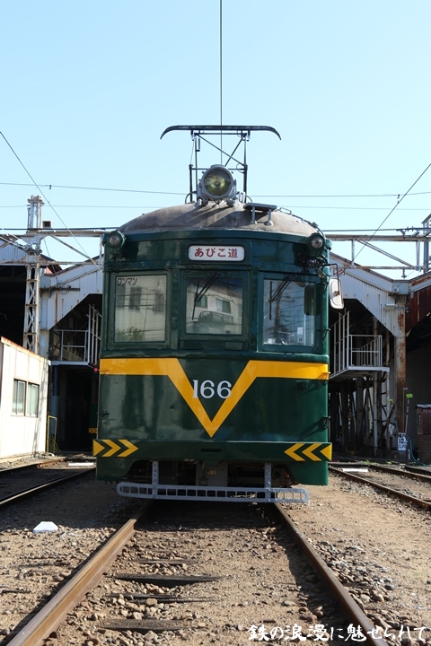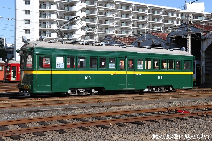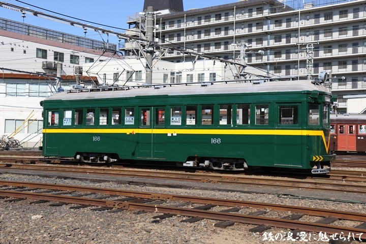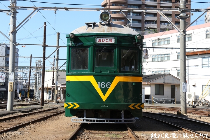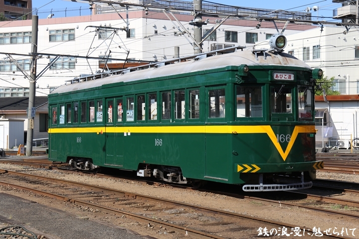 | 続いてモ166号車を撮影します。166号車はビークルスター塗装を施されていましたが残念ながらつい先日、営業運転から離脱しました。まずは外観を撮影。 |