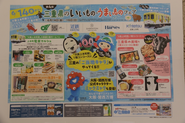 | 本年6月16日(日)、私は"阪急電鉄 プライベース座席体験イベント"へ行った後、大阪メトロ東梅田駅から谷町九丁目駅へ向かい徒歩で近鉄上本町駅へ向かいます。その目的はこの日第4回三重県のいいもの・うまいものフェアの一環で12時から開催される上本町電車マルシェを撮影するため。正直、マルシェより「つどい」を撮影するのが一番の目的だったのですが…。 (^^ゞ汗 |