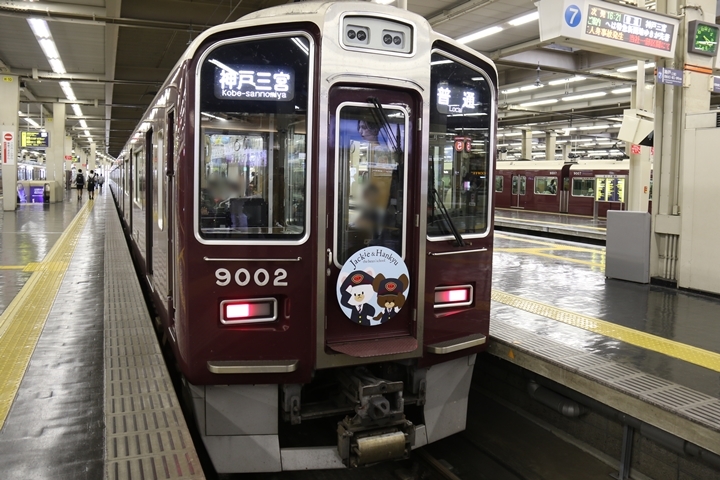 | 大阪梅田駅へ戻って来るとJackie & Hankyuヘッドマークを掲出した神戸線9002Fが停車中だったので撮影。 |