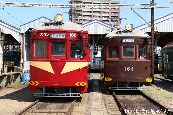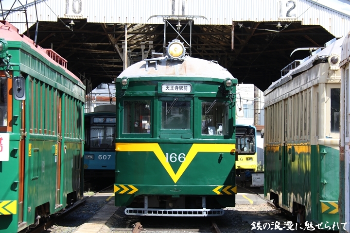 昨年9月17日(日)に足を運んだ阪堺電気軌道によるモ161形撮影会、モ161形は昭和3年/1928年に新造、現役稼働年数が90年を越え日本で定期運用されている電車としては日本最古であります。9時54分に我孫子道車庫に到着しまずはモ164車が単独で中心にいるのを撮影。