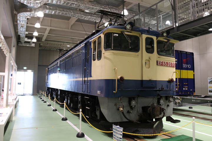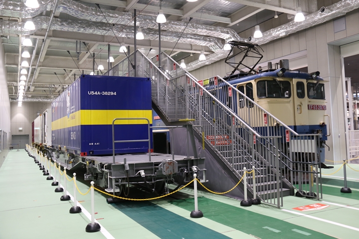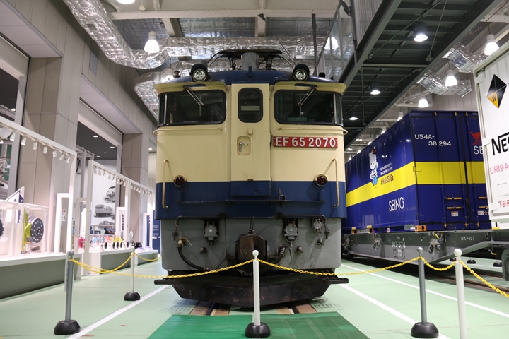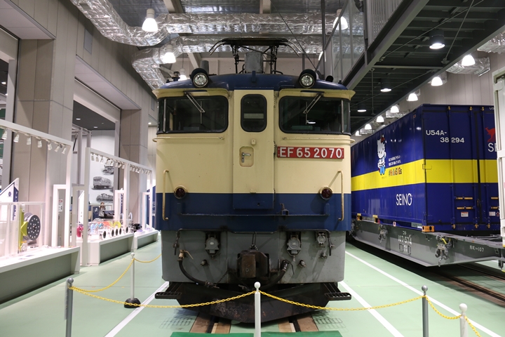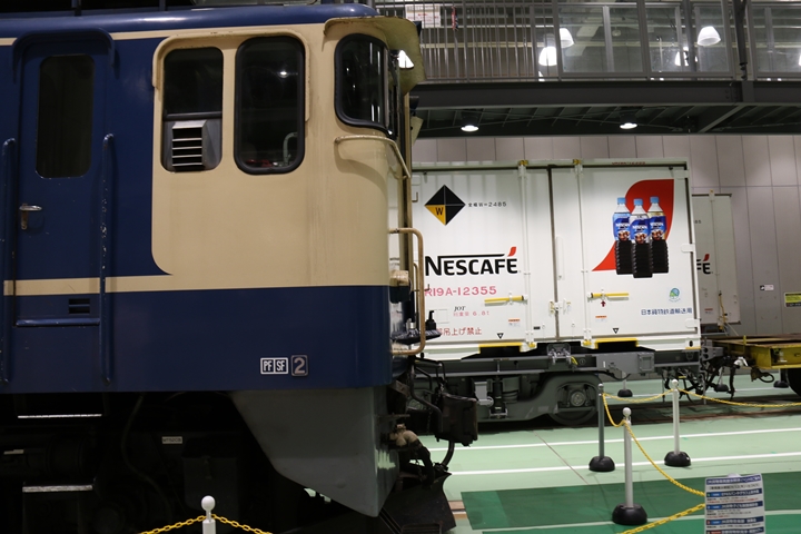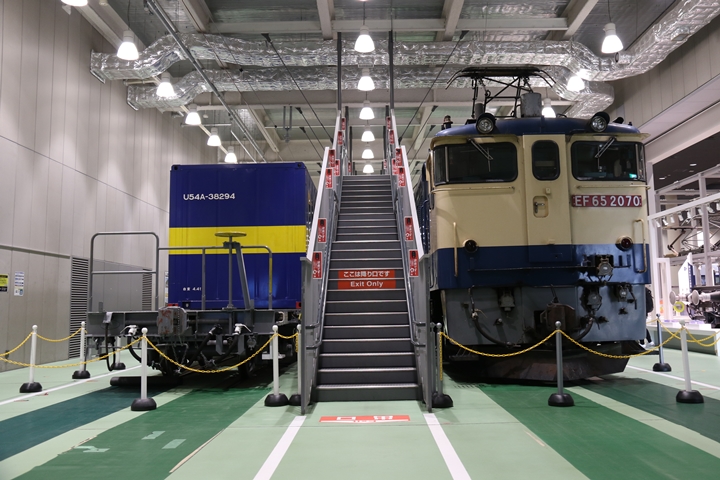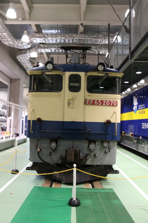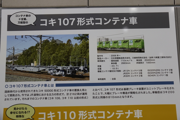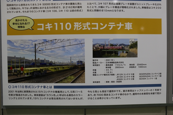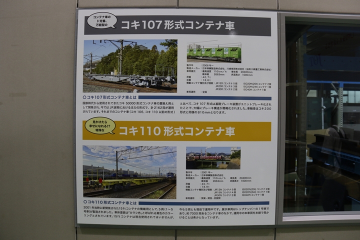 | 私が京都鉄道博物館へ向かった理由、それは9月12日(木)から9月24日(火)まで特別展示されているJR貨物所属車両を撮影するため。今回はEF65形式2000番代直流電気機関車、コキ107形式コンテナ貨車、コキ110形式コンテナ貨車、ヨ8000形式8891号車掌車が特別展示されました。当初、EF510形式7号機交直流電気機関車「レッドサンダー」の予定でしたが4日前の9月8日(日)、突然EF65形式2000番代直流電気機関車へ変更とアナウンスされました。まずは京都方から正面の並びを撮影。 |