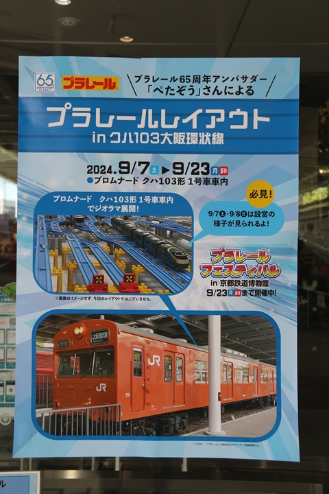 | 現地に行くまで知らなかったのですが「プラレールフェスティバル in 京都鉄道博物館」追加イベントとして9月7日(土)から9月23日(月・祝)までクハ103形1号車車内にて「プラレールレイアウト in クハ103大阪環状線」が開催されていました。 |