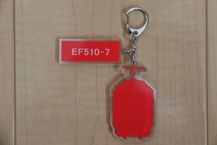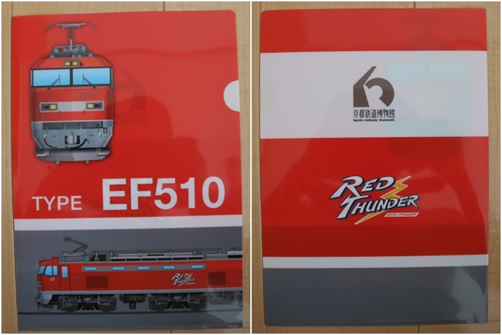 | そしてこの日も散財、EF510形式「レッドサンダー」のクリアファイルとアクリルキーホルダー。前述の通り当初はEF510形式7号機交直流電気機関車「レッドサンダー」が特別展示される予定でした。 |