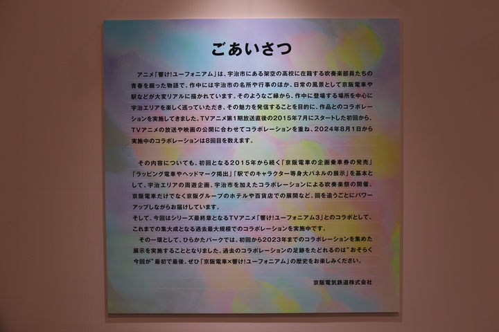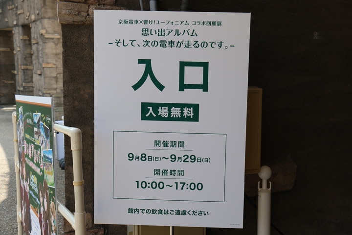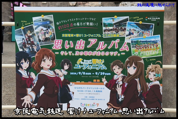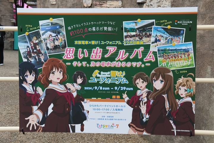| 私がひらかたパークへ向かった理由、それは9月8日(日)から29日(日)までイベントホールUで開催されている「京阪電車×響け♪ユーフォニアム コラボ回顧展 思い出アルバム -そして、次の電車が走るのです。-」を撮影するため。 |