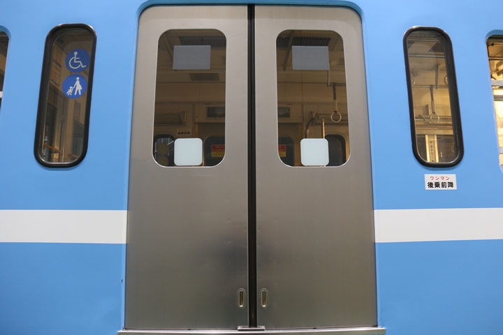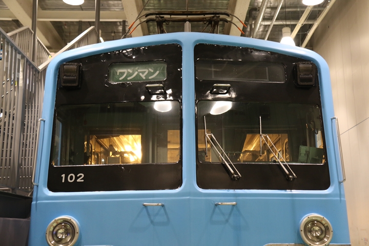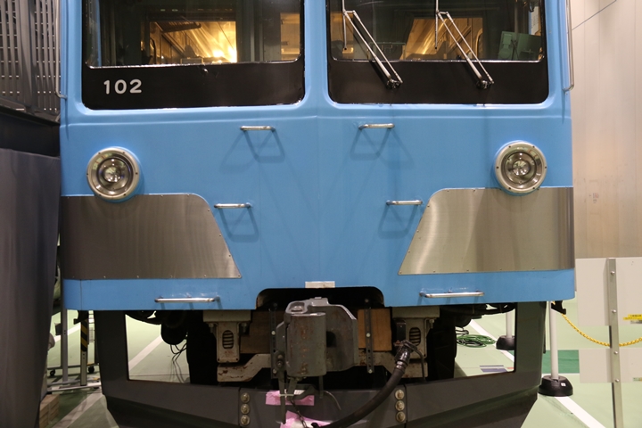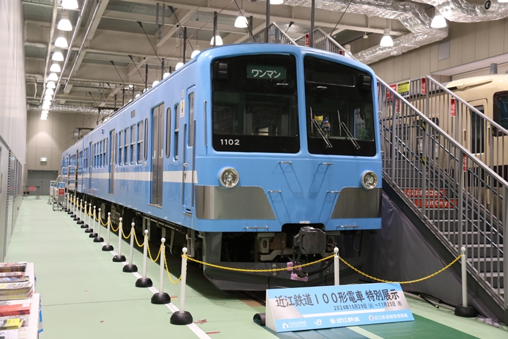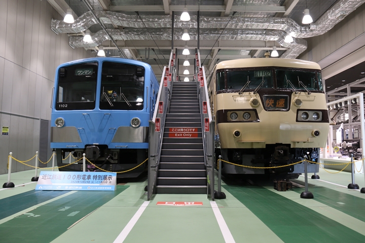 | 私が京都鉄道博物館へ向かった理由、それは10月29日(火)から11月25日(月)まで特別展示されている近江鉄道100形電車を撮影するため。100形は西武鉄道より新101系・301系を譲受・改造した通勤形電車で平成25年12月17日より運行開始しています。11月14日(木)以降はクハ117形1号車とオハ25形551号車を並べて展示しています。まずは京都方から正面の並びを撮影。 |