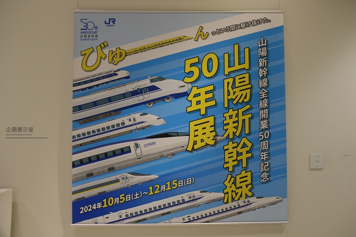| そしてこの日の二つ目の目的は10月5日(土)から12月15日(日)まで企画展示室で行われている山陽新幹線全線開業50周年記念「山陽新幹線50年展」を撮影するため。 |
