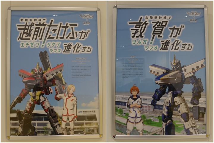 | 企画展示室入口には福井県×シンカリオンコラボポスターとして福井県内の北陸新幹線各駅で掲出されているポスター4種が展示されていました。 |