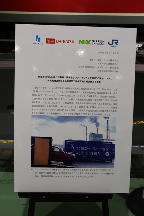| 続いてU32A形式20フィートコンテナを撮影、このコンテナは北越コーポレーション且有コンテナで往路は北越コーポレーション且製品、復路はダイハツ工業鰹ャ型乗用車を運ぶラウンドマッチング輸送を行っています。京都方から正面や側面を撮影。 |