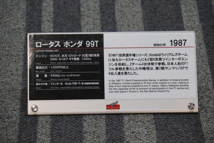 | 10月23日(木)から12月21日(日)まで「レーシング&レールウェイヒストリー」が企画されており第1弾として10月23日(木)から11月16日(日)まで本館1階には「Lotus Honda 99T」が展示されていました。 |