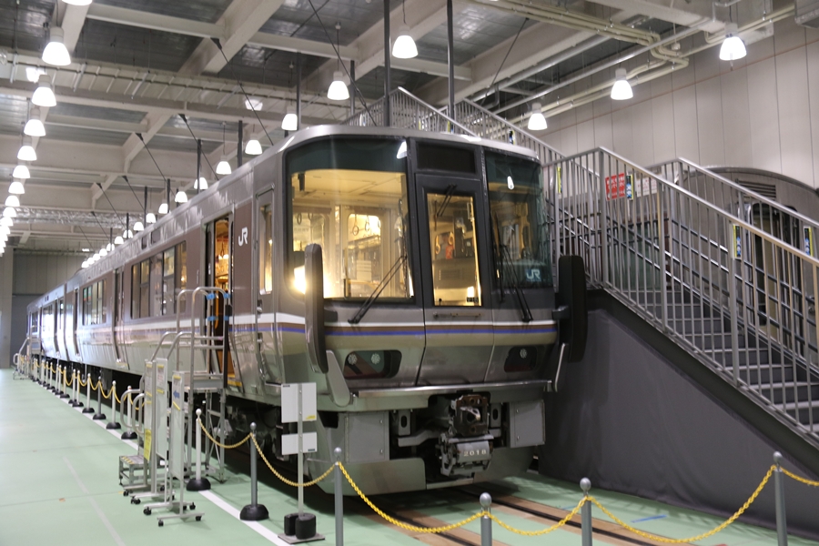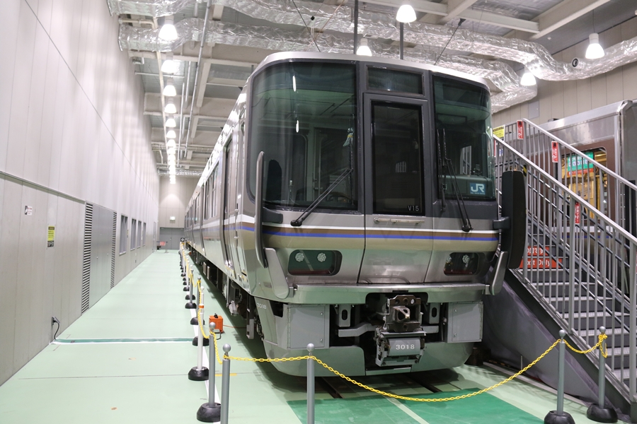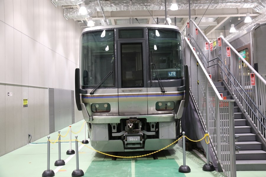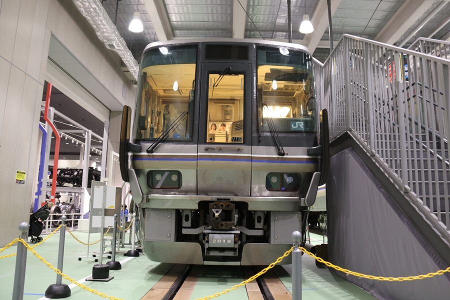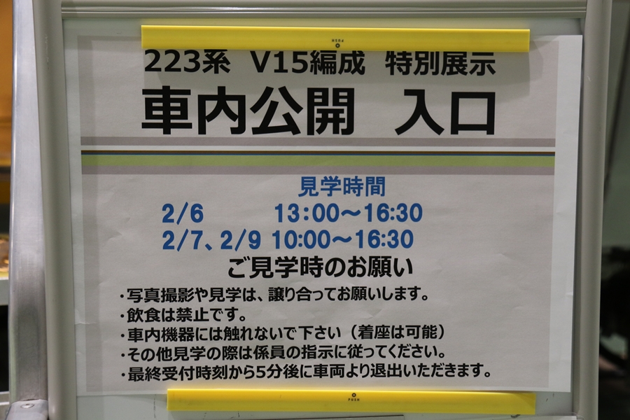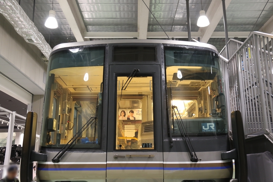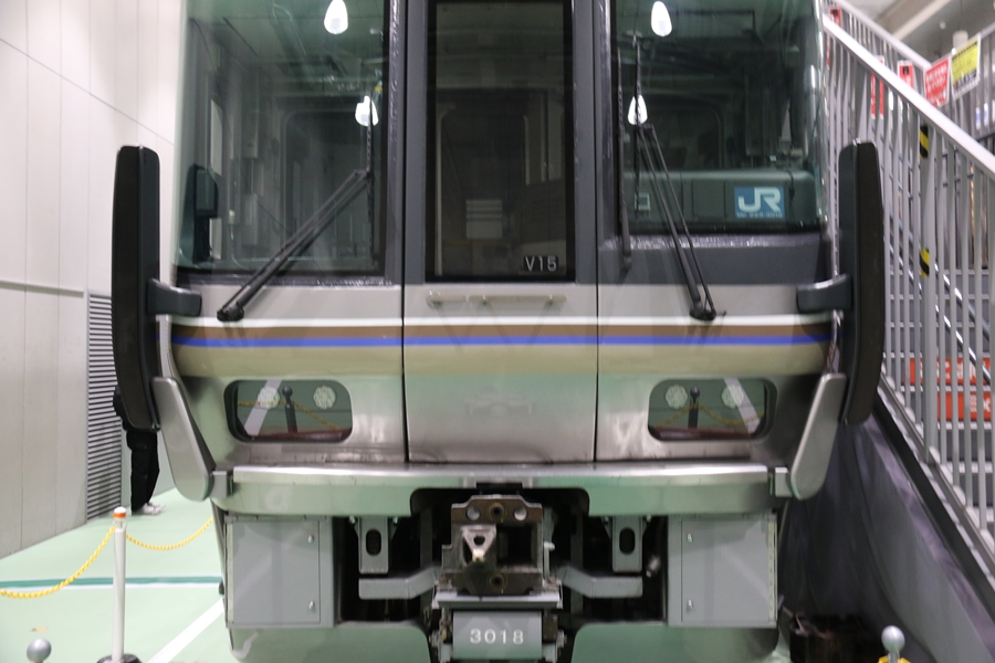| 私が京都鉄道博物館へ向かった理由、それは2月6日(金)から2月9日(月)まで特別展示されている223系2000番台V15編成を撮影するため。223系は直流近郊形電車で平成6年より運行開始、2000番台は東海道・山陽本線の113系・117系・221系の置き換えを目的に平成9年から平成20年に合計648両新造、223系の中で最大勢力となるグループです。まずは正面の並びを撮影。 |