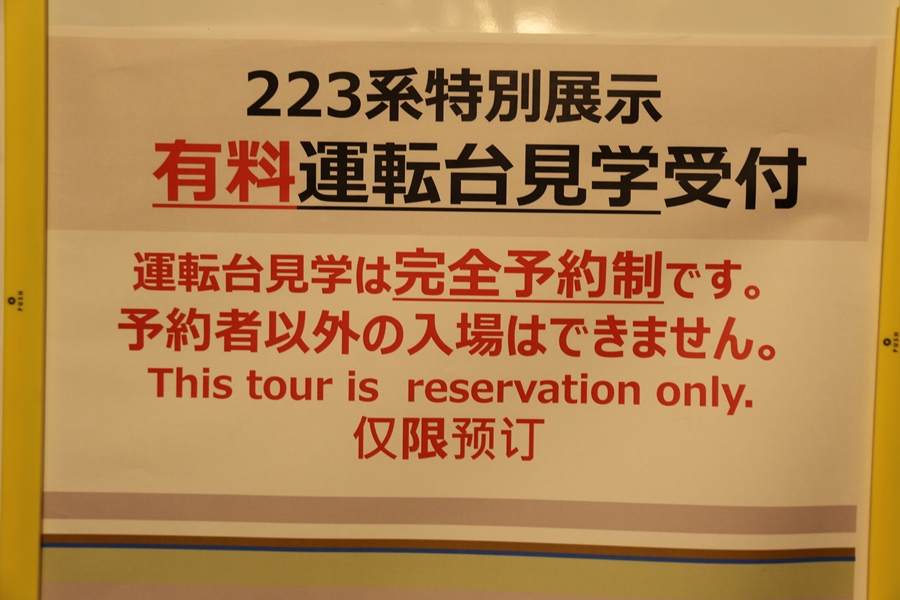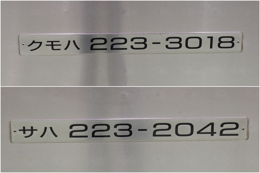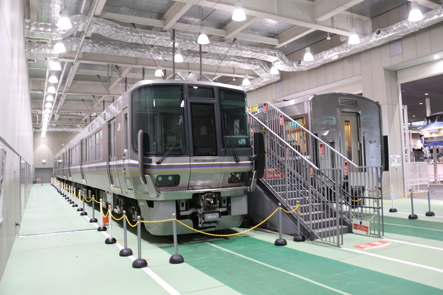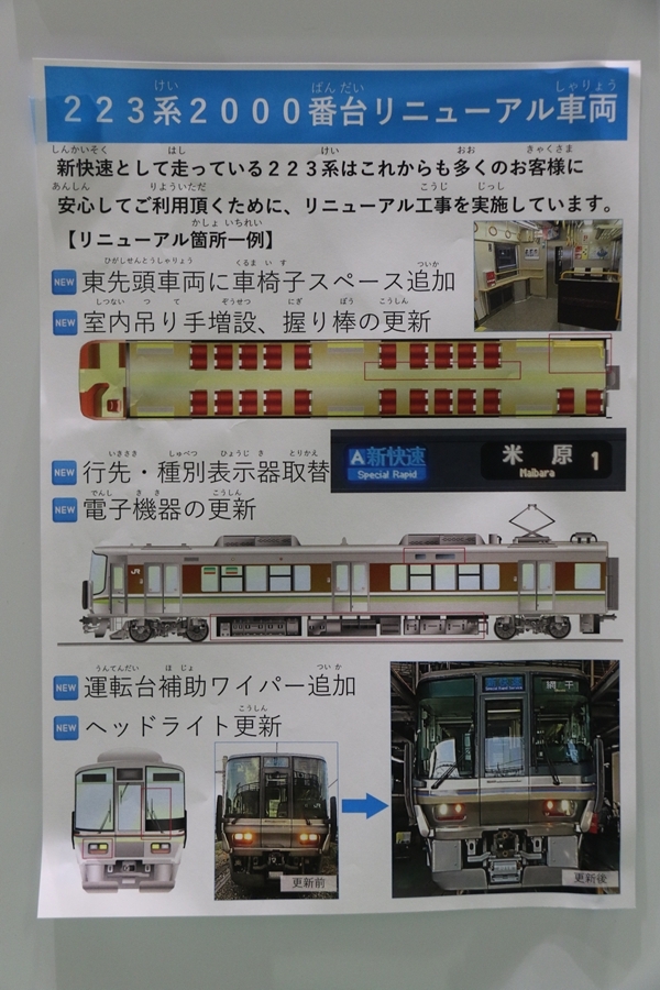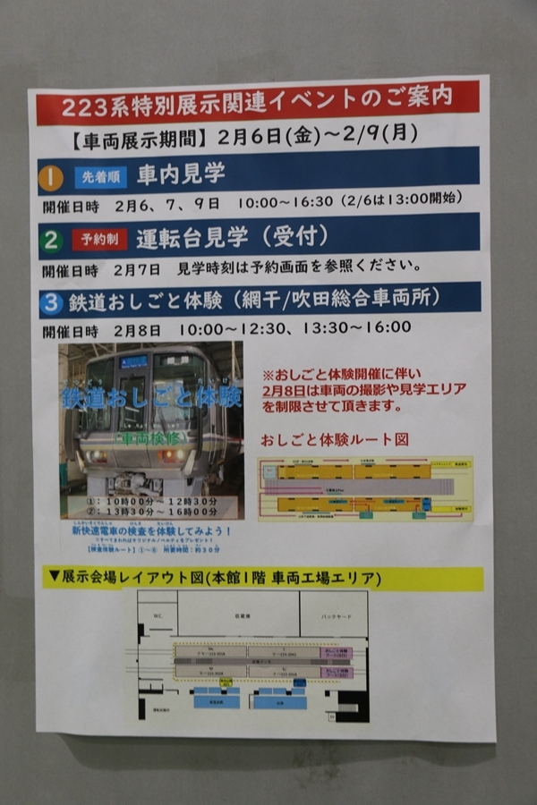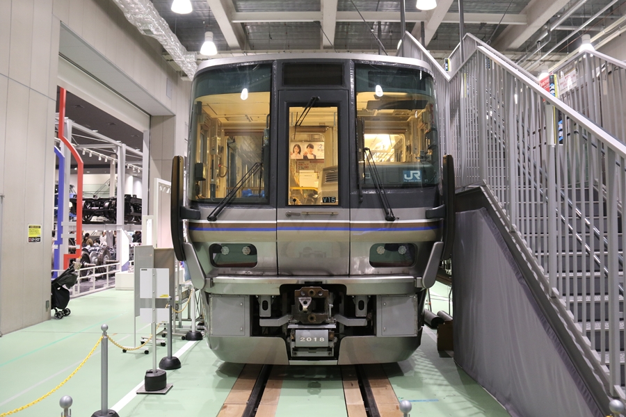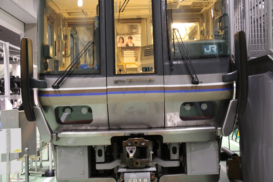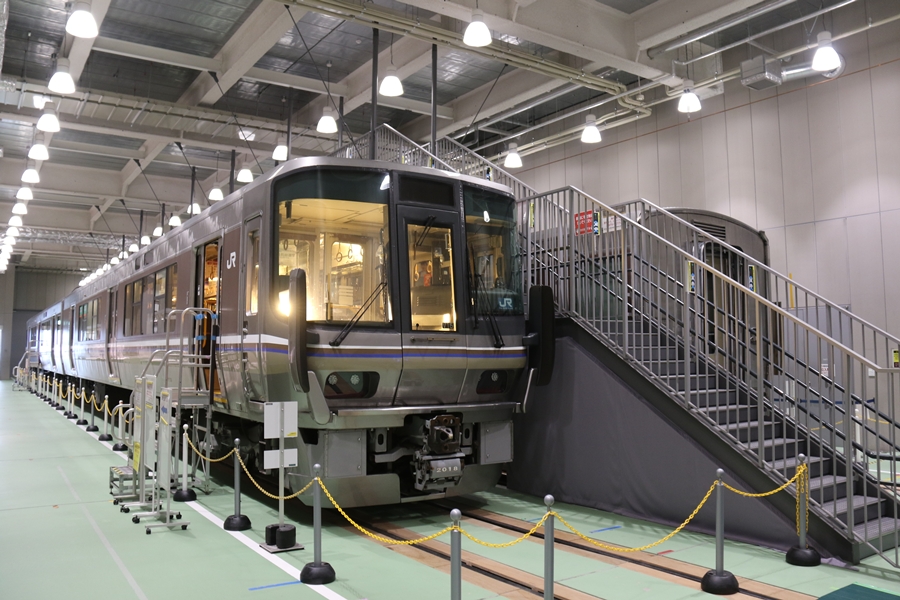| 私が京都鉄道博物館へ向かった理由、それは2月6日(金)から2月9日(月)まで特別展示されている223系2000番台V15編成を撮影するため。223系は直流近郊形電車で平成6年より運行開始、2000番台は東海道・山陽本線の113系・117系・221系の置き換えを目的に平成9年から平成20年に合計648両新造、223系の中で最大勢力となるグループです。まずは正面の並びを撮影。 |