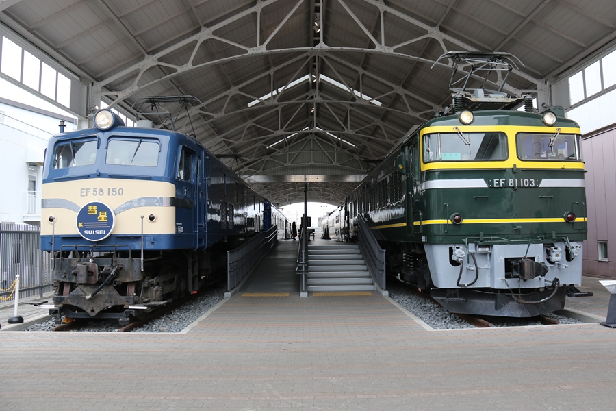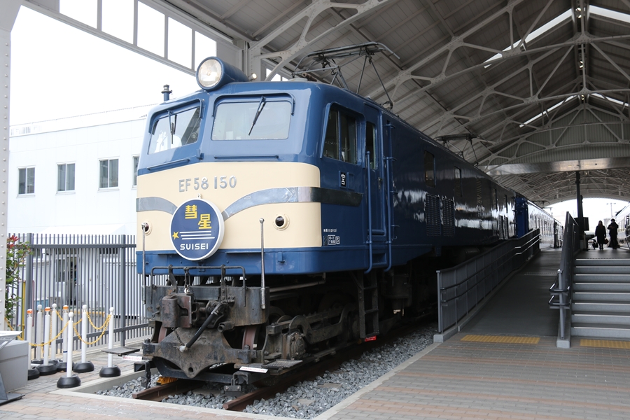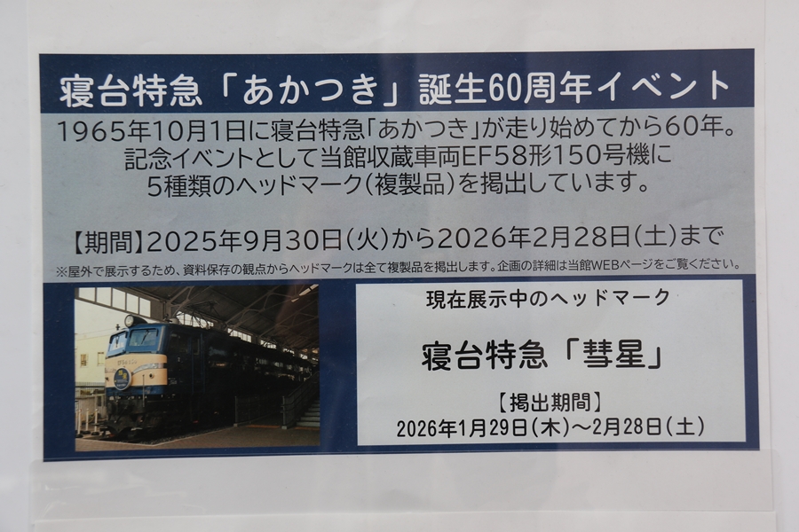 | 寝台特急「あかつき」誕生60周年イベントとして9月30日(火)から来年2月24日(火)までトワイライトプラザのEF58形150号機に5種類のヘッドマークが掲出されておりこの日は「彗星」でした。 |