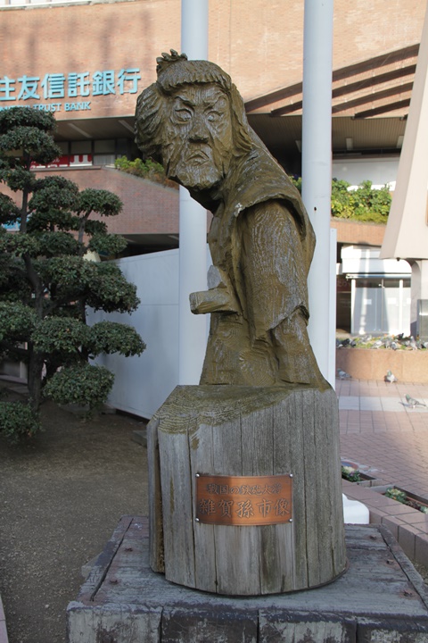 駅前には戦国時代、織田信長の軍勢を苦しめた雑賀孫一像が展示されています。