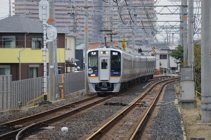 | 先月22の台風21号で男里川の橋脚が傾斜、先月31日まで樽井駅〜尾崎駅間が不通になりました。その間、イレギュラーな運行として尾崎−和歌山市間で普通が運行されました。和歌山市駅発尾崎行き、その編成が尾崎駅へ到着、そして難波方のポイントで入れ替え。その寸景を撮影してきました。まずは和歌山市駅から尾崎駅へやってきた普通尾崎行き。そして一旦、難波方へ引き上げます。 |