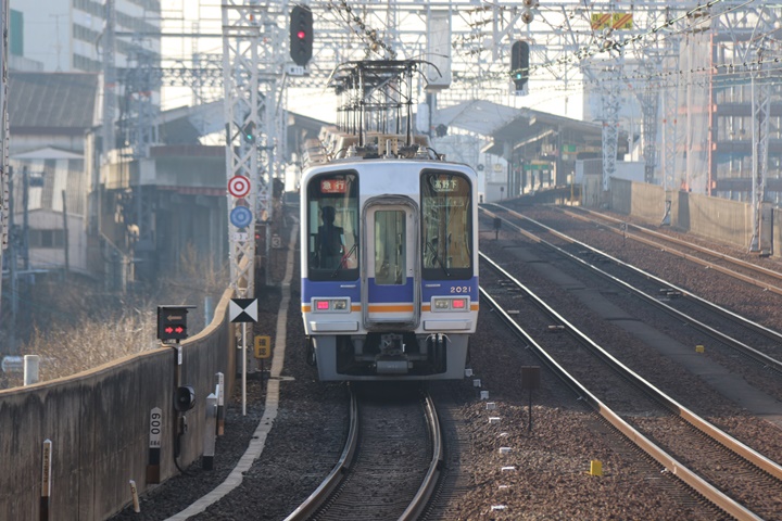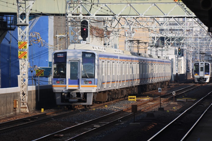 | 続いて7th CHAPTER、新今宮駅9時12分発高野線0206レ、新今宮駅9時13分発南海線0208レの画像から御紹介します。当CHAPTERの注目は太陽に輝く泉北12000系泉北ライナー。9時を過ぎると太陽の光がエエ感じに車両を輝かせます。 |