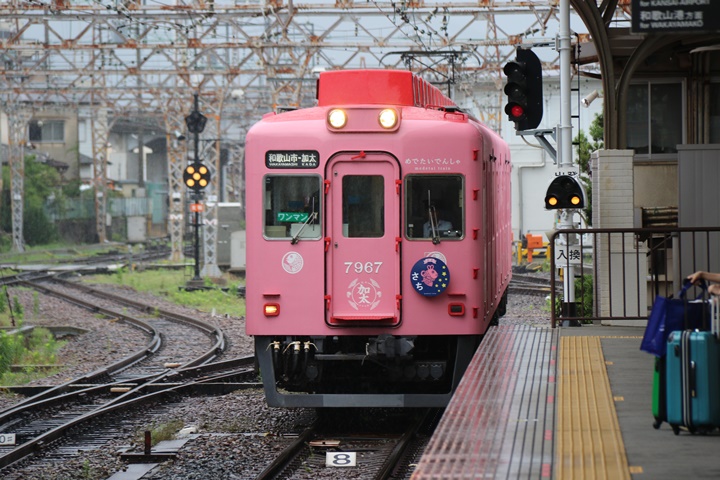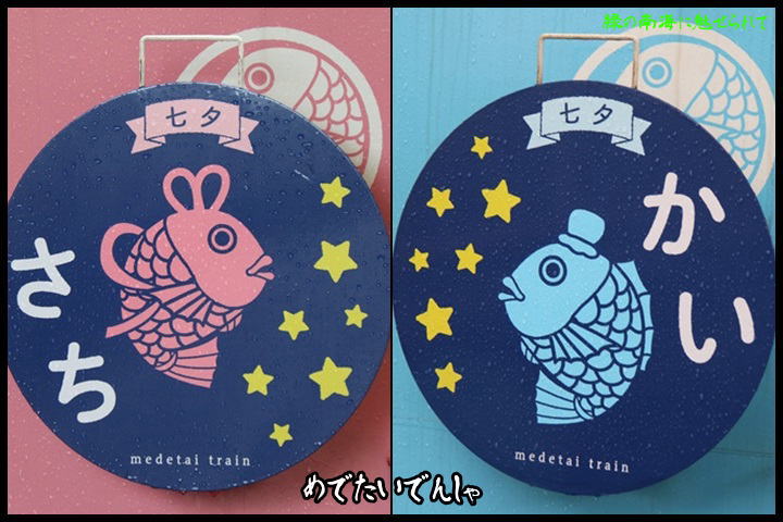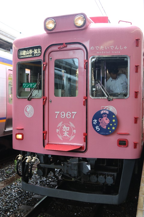 めでたいでんしゃ 七夕イベントにともない今月2日(月)から8日(日)までのわずか1週間のみ七夕限定のヘッドマークを掲げるめでたいでんしゃを撮影するために和歌山市駅へ。ただ残念ながら豪雨のために七夕イベントは中止、そして8時51分発が一般車に変更されており予定が大きく狂う。