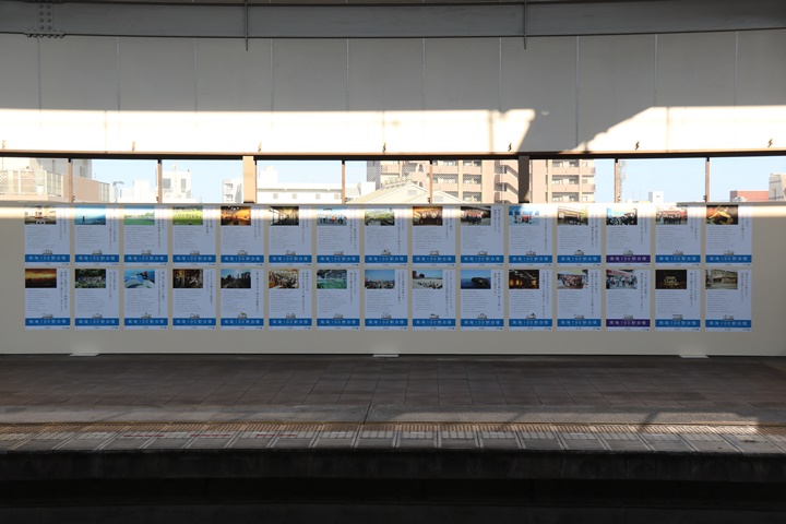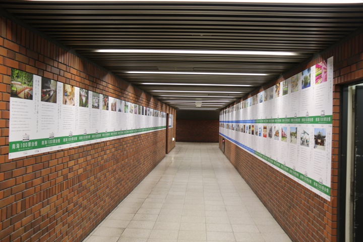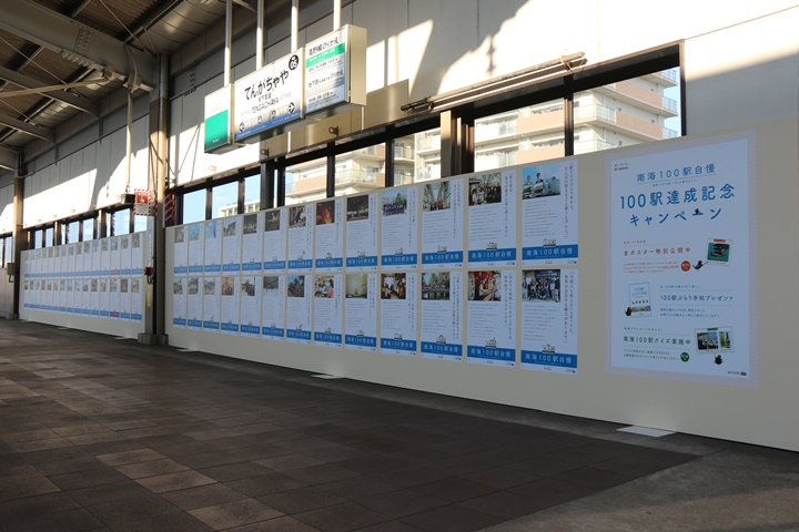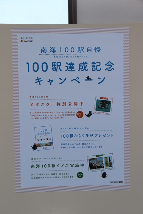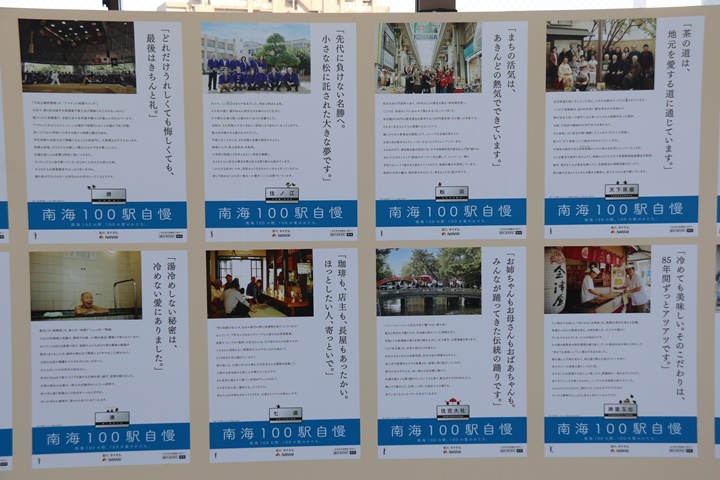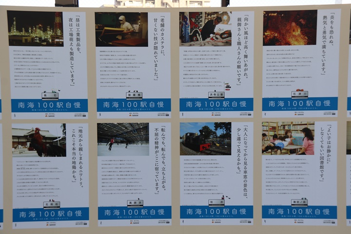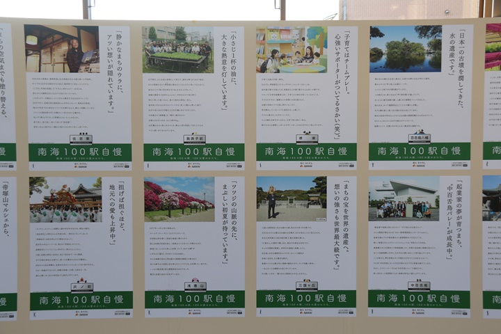| 平成27年から制作してきた「南海100駅自慢」が全駅分完成したのを記念して今月1日(水)から「南海100駅自慢」ポスターギャラリーが難波駅と天下茶屋駅で開催されています。まずは難波駅2階連絡通路の寸景。 |