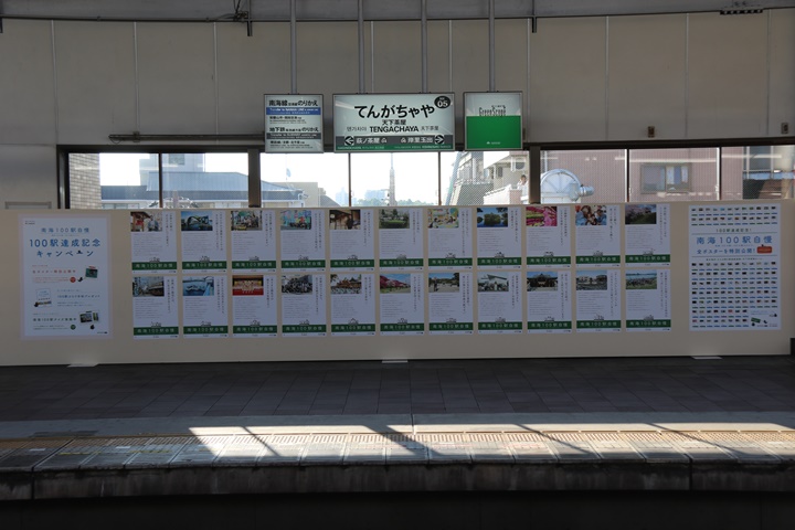 | 続いて天下茶屋駅4番線乗り場、1番線乗り場の寸景。4番線に南海線56枚、1番線に高野線44枚が掲出されています。 |