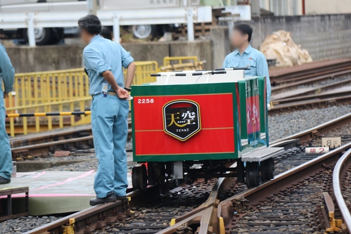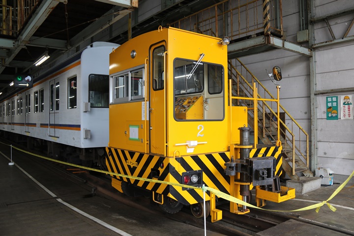 | そして私は工場内へ。メンテナンス中の車両が多数展示されている中、電車綱引き体験用に10004車が用意されていました。 |
