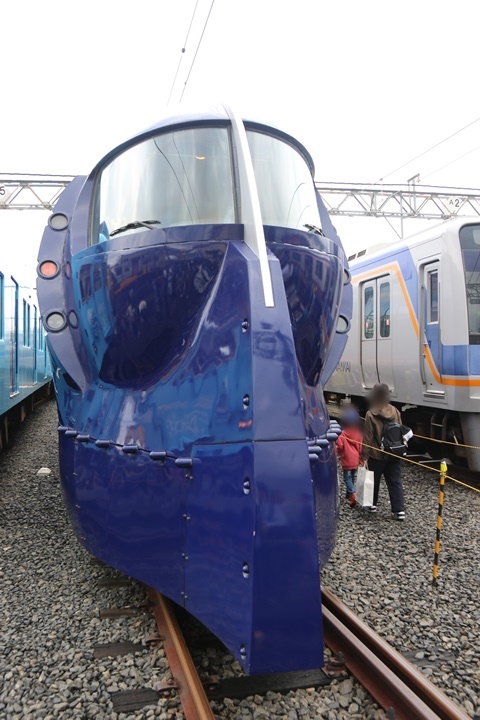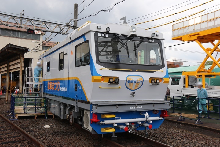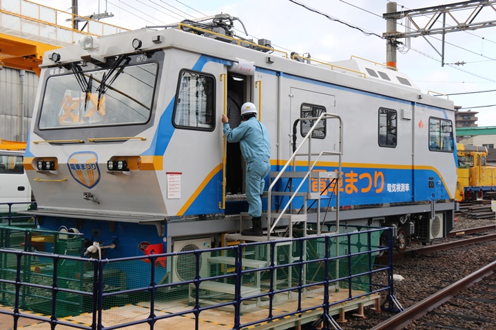 | まず電気検測車を発見、車体前面と側面には「電車まつり」のロゴが施されていました。電気検測車をこんな近くで見るのは初めてです。中に入れば良かったと今さらながら後悔、来年は中の様子を撮影しようと思います。 |