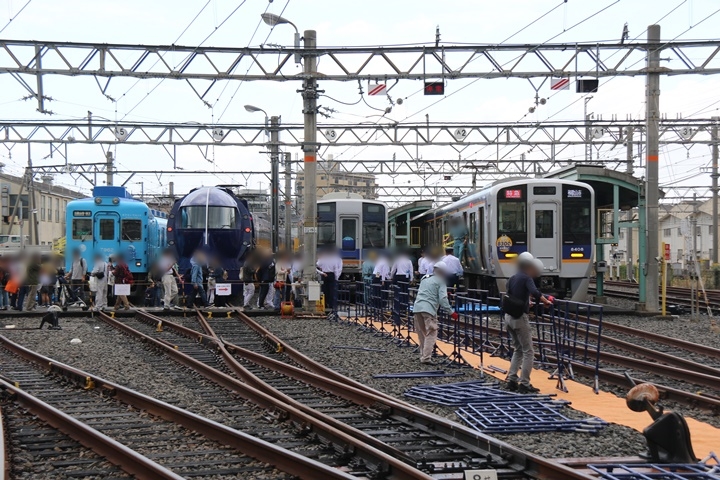 | 続いて車両展示。左から先日、婚約報道がされためでたいでんしゃ"かい"、ラピート、1000系、8300系。かいとラピートは車内が見学できましたが私はパス。8300系は車内非難誘導体験の準備中でした。 |