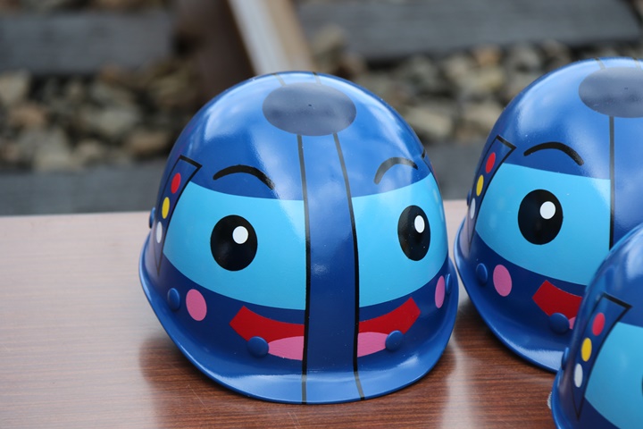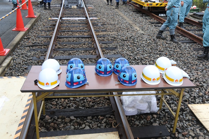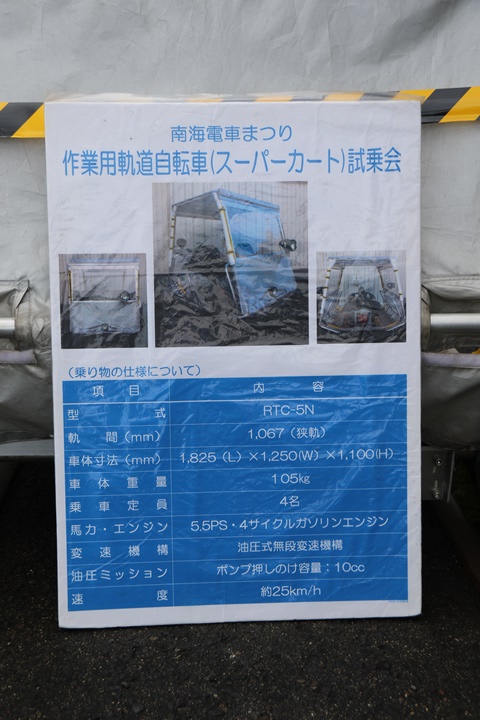 | 続いて作業用軌道自転車(スーパーカート)試乗会、残念ながら私は乗車しませんでしたが安全対策のため、ラピート柄のヘルメットまで用意していました。 |