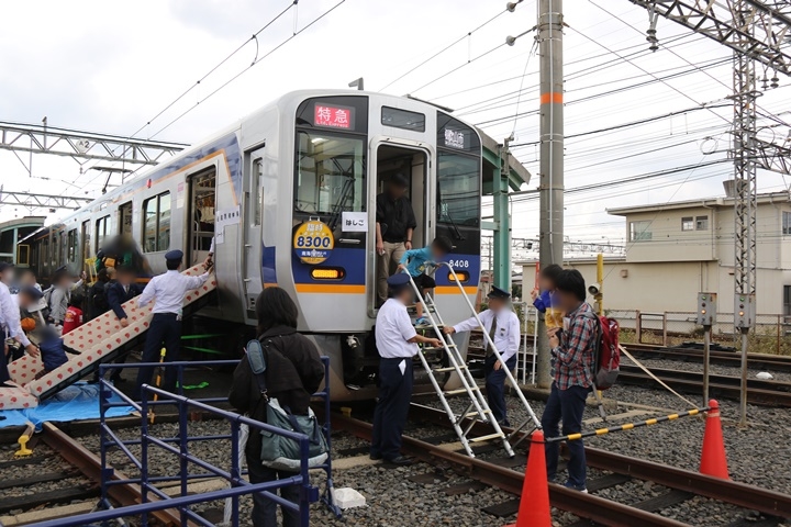 | 私は再び車両展示コーナーへ。めでたいでんしゃ・ラピートの車内見学には長蛇の列。そして先ほど何かの作業をしていた8300系が車内避難誘導体験が行われていました。 |