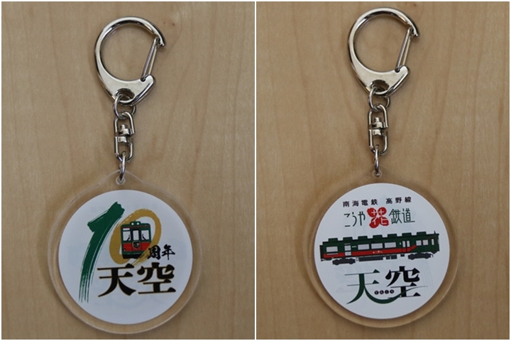 | これで10周年記念グッズをコンプリート。左から乗車証、キーホルダー、そして高野山駅でのガチャガチャのキーホルダー。 |