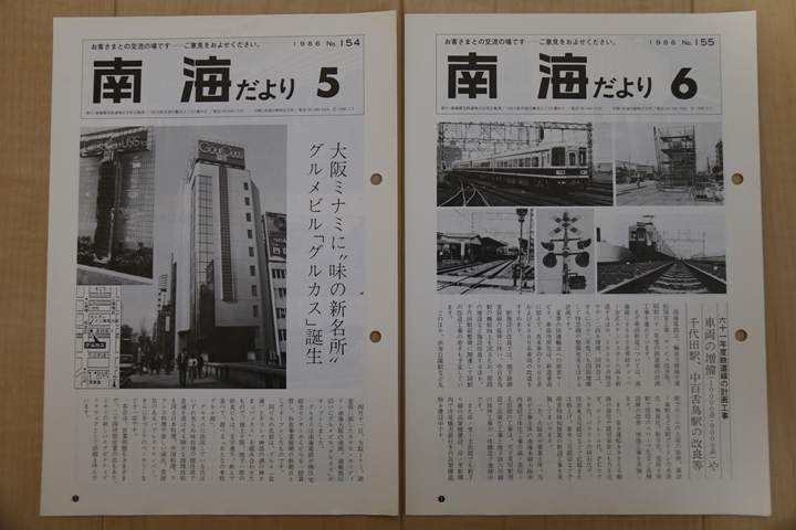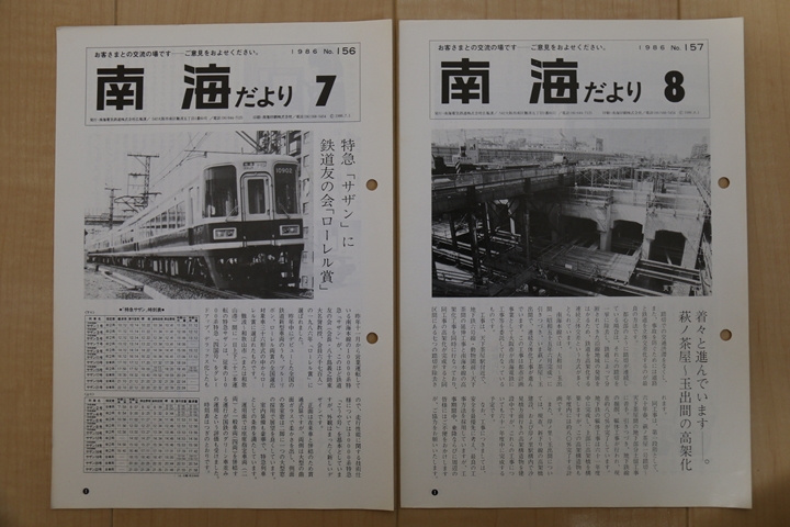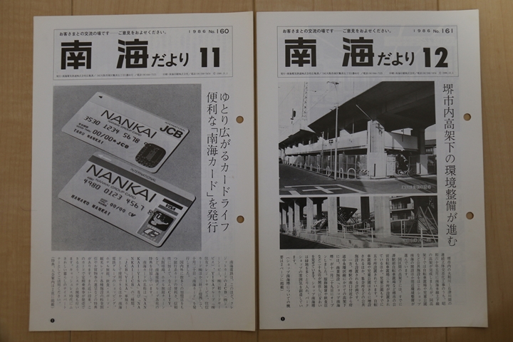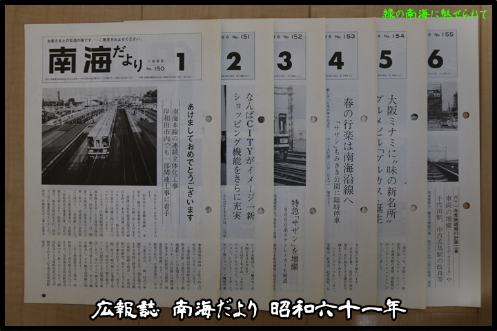 今から35年前の昭和61年の広報誌「南海だより」を御紹介しようと思います。現在は「ニュース南海」と題してNATTSに掲載されてますが当時は「南海だより」と言うタイトルでした。本当なら広報誌の中身をスキャンして御紹介したいのですが著作権法律面等にうとい私、とりあえず表紙を撮影し昭和61年上半期の表紙とタイトルを整理してみました。![]() 昭和61年1月号(150号) ・南海本線の連続立体化工事 岸和田市内でも一部関連工事に着手 ・インフォメーション NANNET 難波駅コンコースで情報サービス中 ・優れたまちなみ橋本林間・城山台 和歌山県ふるさと建築景観賞受賞 ・資本金207億円に増資完了しました 昭和61年2月号(151号) ・なんばCITYがイメージ一新 ショッピング機能をさらに充実 ・みさき公園、さやま遊園 春の催しが決まりました ・中型スケルトン・サロンカー「ハレークィーン号」が新登場 ・住ノ江駅前に新ビルを建築 ・串本−大島間 新造船が就航 ![]() 昭和61年3月号(152号) ・特急「サザン」を増備 9000系ステンレスカーも新造 ・「シティスポーツすみのえ」に室内テニスコートを新設 ・和歌山−徳島航路 一日8便に増便 ・無線で安心作戦 南海タクシーグループ 昭和61年4月号(153号) ・春の行楽は南海沿線へ 「サザン」もみさき公園に臨時停車 ・「ホテル南海・さかい」 4月25日堺駅前にオープン ・グルメビル「グルカス」が4月11日御堂筋にオープン ・豪華な中二階観光バスがデビュー ![]() 昭和61年5月号(154号) ・大阪ミナミに"味の新名所"グルメビル「グルカス」誕生 ・なんばシティがリニューアル ・南海美加の台で第2回住宅フェア ・美加の台案内所がオープンしました ・美加の台駅にタクシー呼出電話 昭和61年6月号(155号) ・61年度鉄道線の計画工事 車両の増備(10000系・9000系)や千代田駅、中百舌鳥駅の改良等 ・インフォメーション「NANNET」堺駅、堺東駅でも情報サービス開始 ・電車・バスの冷房車増強 ![]() 前回に続いて今から35年前の昭和61年の広報誌「南海だより」、今回は7月以降の下半期を御紹介しようと思います。前回同様本当なら広報誌の中身をスキャンして御紹介したいのですが著作権法律面等にうとい私、とりあえず表紙を撮影し昭和61年下半期の表紙とタイトルを整理してみました。 ![]() 昭和61年7月号(156号) ・特急「サザン」に鉄道友の会「ローレル賞」 ・ベル・キャプテンシステム「知っテルビジョン」を新設 ・難波と和歌山市に指定券販売機増設 ・花嫁専用車ブライダルサルーン 南海タクシー ・海水浴など夏の輸送を迎えて南海線、高野線で臨時増発 昭和61年8月号(157号) ・着々と進んでいます。萩ノ茶屋−玉出間の高架化 ・泉北、狭山両タウン間のバスが便利になりました ・南海住ノ江ビルが完成しました ・新型バスを投入 和歌山バス ![]() 昭和61年9月号(158号) ・駅施設の改良が進んでいます ・新しいサービスつぎつぎ登場 なんばCITYネットワークショップ ・高師浜駅前に「南海研修所」 ・和歌山バスがイメージ一新 ・連続六期無事故表彰 昭和61年10月号(159号) ・特急「サザン」100万人突破 10月に記念イベントを開催 ・街づくりが進む「南海美加の台」 第3回住宅フェアを開催 ・見やすい総合案内板を新設 和歌山バス ・本格的露天風呂が完成 南紀白浜旅館「朝日」 ![]() 昭和61年11月号(160号) ・ゆとり広がるカードライフ 便利な「南海カード」を発行 ・安全とサービス向上アピール バス増客キャンペーン実施中 ・11月9日 ローレル賞授賞式 「特急サザン」記念乗車券も発売 ・南海タクシーグループが全国27社と提携 チケットによる共通乗車券をスタート ・なんば駅に新空港パネル登場 昭和61年12月号(161号) ・堺市内高架下の環境整備が進む ・特急「サザン」 鉄道友の会「ローレル賞」受賞 ・南海本線堺駅南口の高架下に「ショップ南海堺」オープン ・当社バス、重大責任事故皆無で近畿運輸局長表彰を受ける ・夢のスーパーハイデッカー車 御坊南海バスがはじめて投入 ・定期・回数券が映画割引券に 和歌山バスがユニーク新商法 この企画の本当の目的、それは今から35年前の最新ニュースを御紹介できる点。この年は10000系サザンが鉄道友の会ローレル賞受賞と言うめでたい一年でした。ちなみにこの年のブルーリボン賞は伊豆急行2100系「リゾート21」、小学生だった私は「サザン」以上に度肝を抜かれた列車です。最後にオマケでローレル賞受賞記念乗車券とテレホンカード。 ![]() |