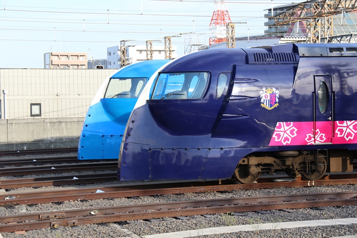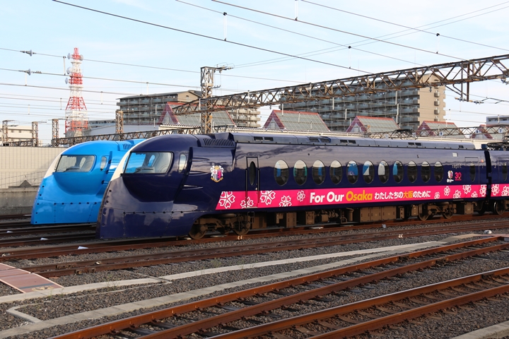 | 本年4月13日(土)、私は住ノ江車庫に並ぶラピートを撮影するために急遽、住ノ江駅で下車。4月8日(月)から運行開始したセレッソ大阪×特急ラピート30周年記念ラッピングとこの日から運行開始した大阪関西万博ラッピングラピートが住ノ江車庫3番線・5番線に並んで停車。しかも早朝だったので順光。あたかも2編成の「撮影会」が行われるような並びでした。 |
