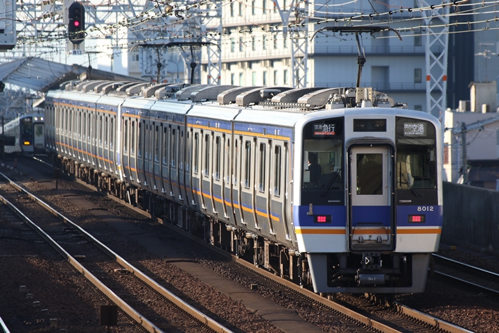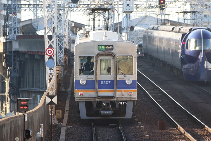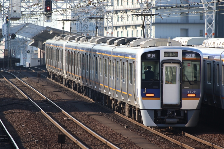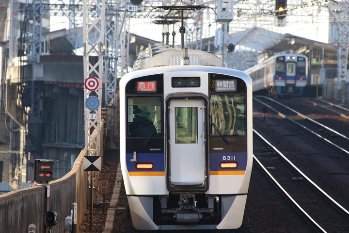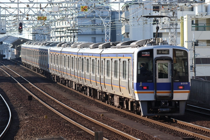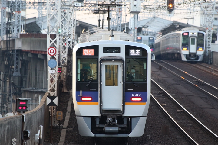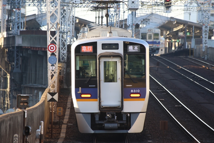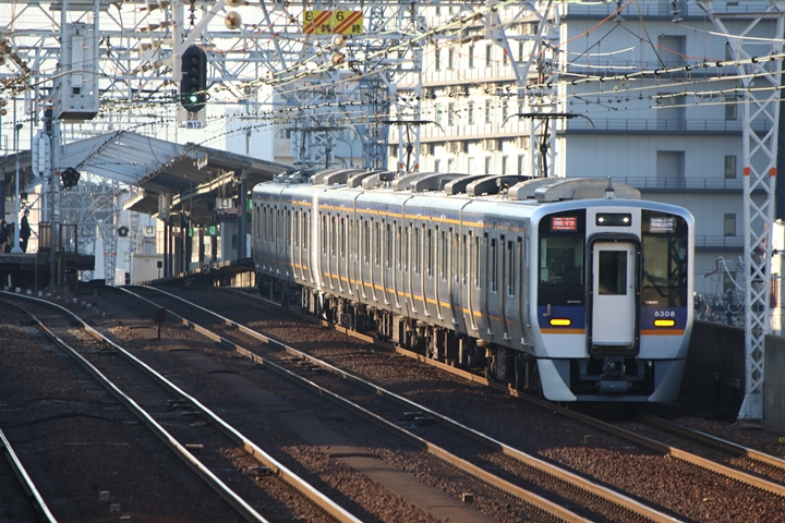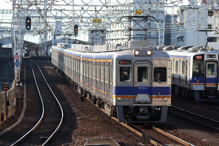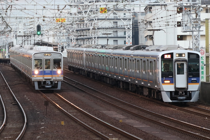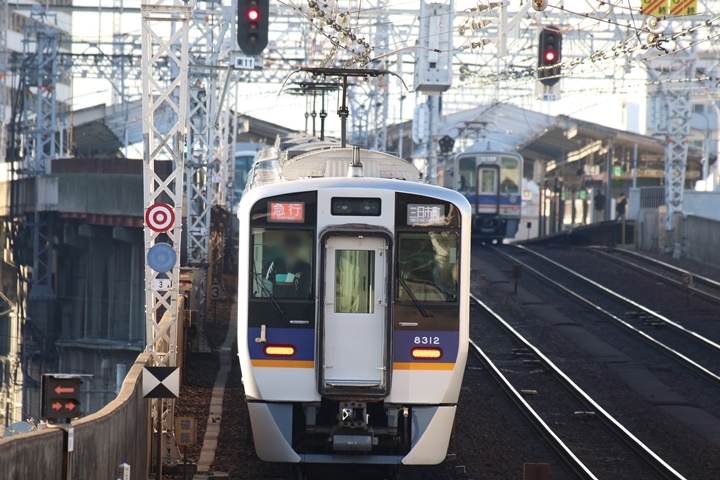 | 続いて4th CHAPTERでは新今宮駅7時19分発高野線各停なんば行き、なんば駅7時19分発南海線急行和歌山市行きの画像から御紹介します。当CHAPTERの注目は平日ダイヤで唯一運行されている8連の特急りんかん、この日は31000系+30000系がやって来ました。 |