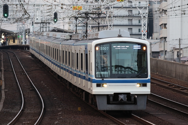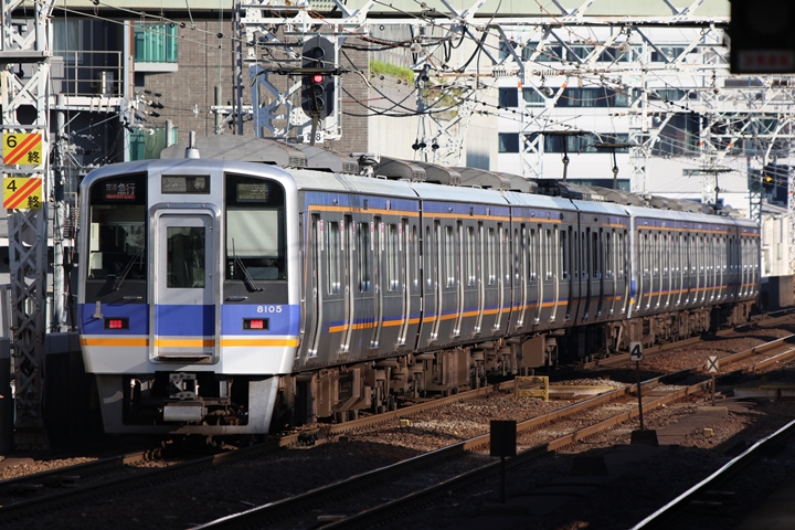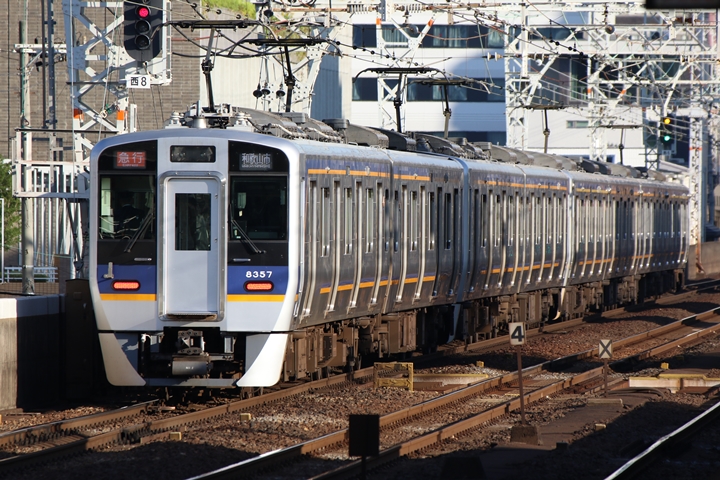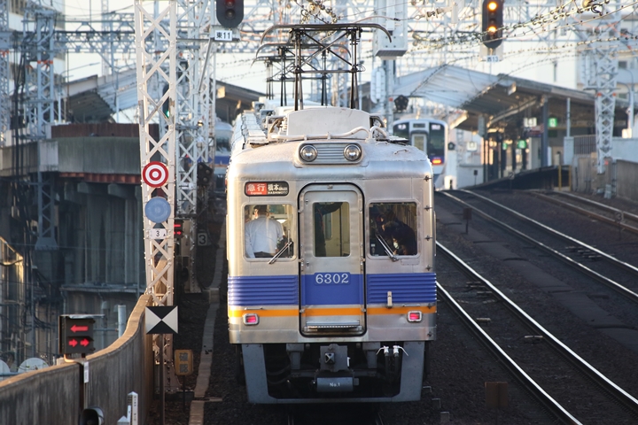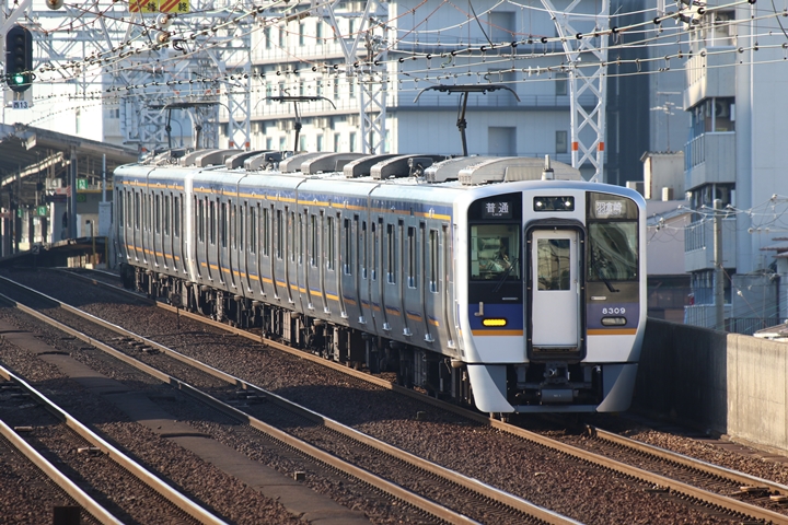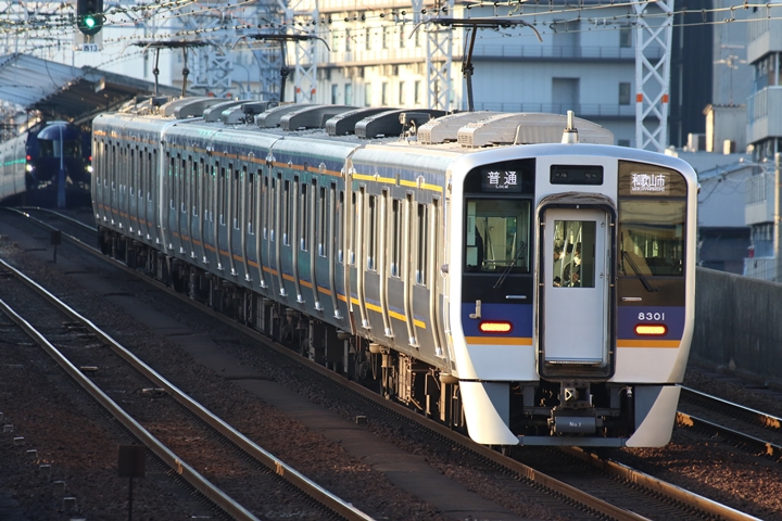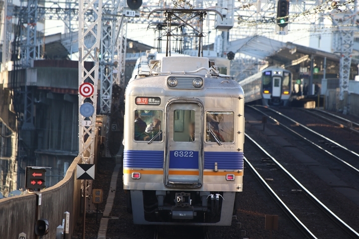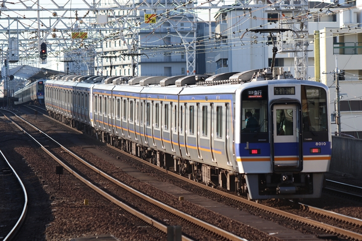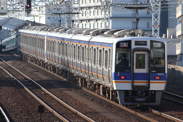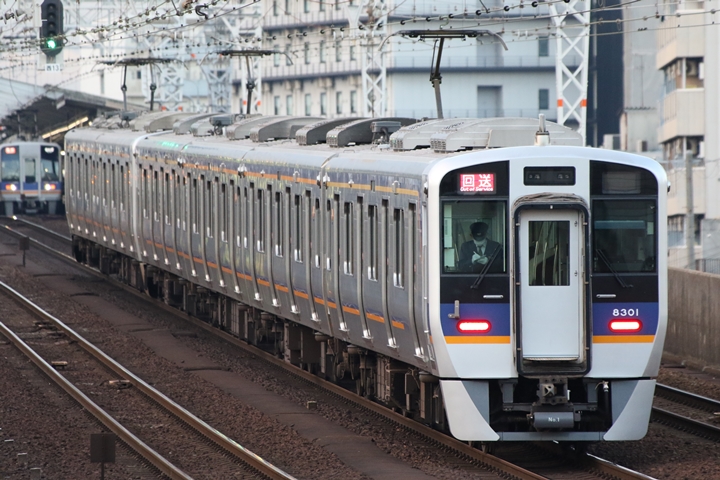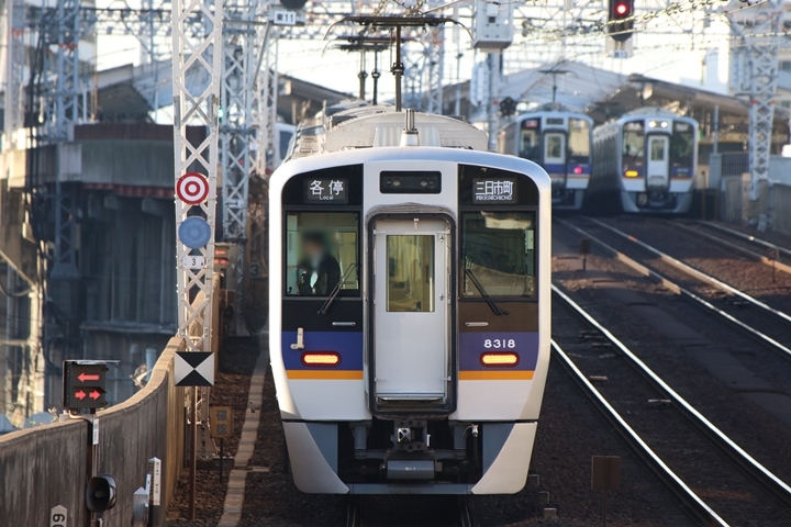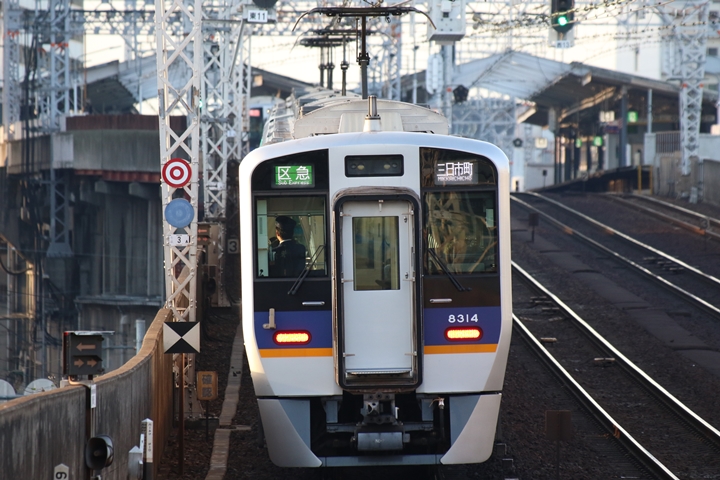 | 続いて4th CHAPTERでは新今宮駅7時19分発高野線各停なんば行き、なんば駅7時19分発南海線急行和歌山市行きの画像から御紹介します。当CHAPTERの注目は平日ダイヤで唯一運行されている8連の特急りんかん、この日は31000系+30000系がやって来ました。 |