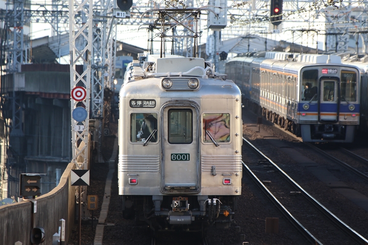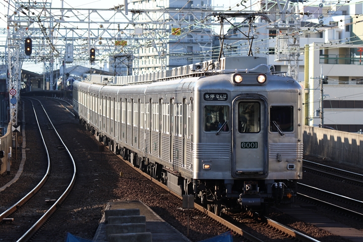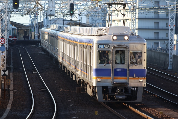 | 続いて7th CHAPTERではなんば駅8時0分発南海線特急ラピート関西空港行き、なんば駅8時0分発高野線区間急行林間田園都市行きの画像から御紹介します。当CHAPTERの注目は「お銀」こと復刻デザインの6000系6001F、朝日に照らされながら運よくやって来ました。 |