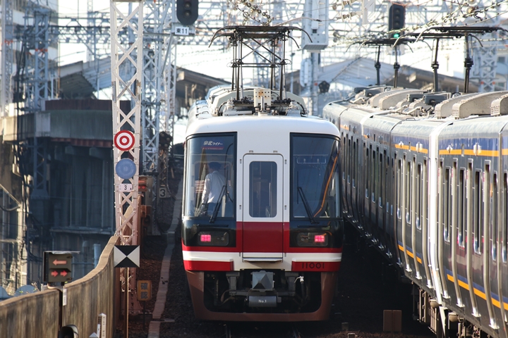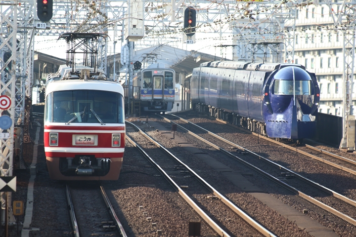 | 最後に11th CHAPTERではなんば駅8時42分発高野線特急こうや高野山行き、新今宮駅8時44分発南海線特急ラピートなんば行きの画像から御紹介します。当CHAPTERの注目は南海のフラグシップトレイン30000系と50000系の並び、運よく共演を撮影できました。 |