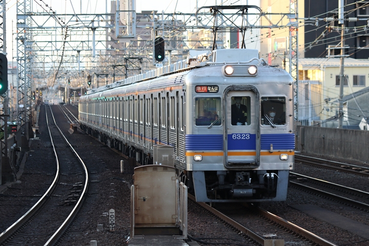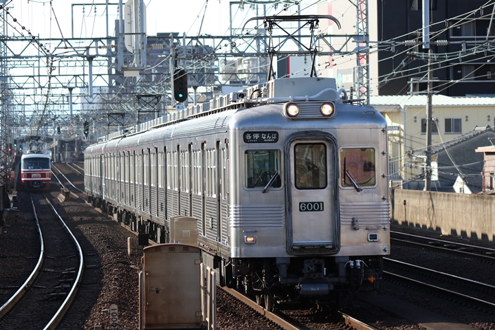 | 続いて3rd CHAPTERでは新今宮駅7時44分発南海線回送車、天下茶屋駅7時44分発高野線急行なんば行きの画像から御紹介します。当CHAPTERの注目は当CHAPTERの注目は今のウチに撮りためしておきたい6000系、「お銀」こと復刻デザインの6000系6001Fに注目が集まる中、現行塗装の6023Fがやって来ました。 |