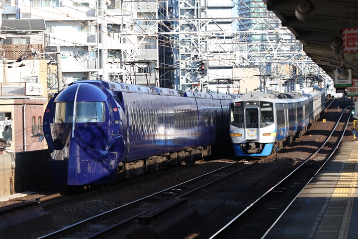 | 続いて7th CHAPTERでは新今宮駅8時47分発南海線特急サザン和歌山市行き、天下茶屋駅8時50分発高野線各停なんば行きの画像から御紹介します。当CHAPTERの注目は「お銀」こと復刻デザインの6000系6001F、ただ30000系との並びを撮影したのですがうまい事並ばず残念な一枚に仕上がりました。 |