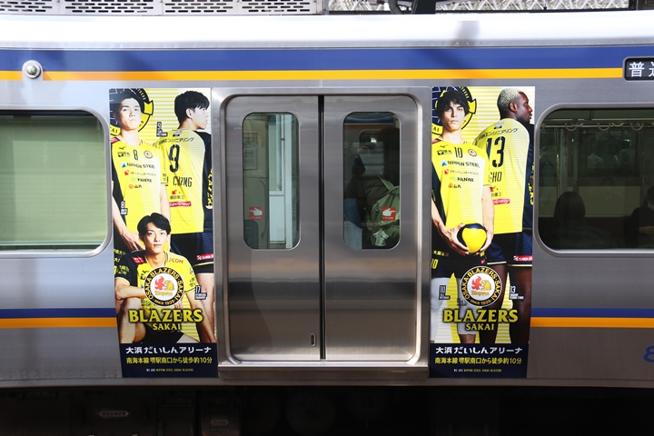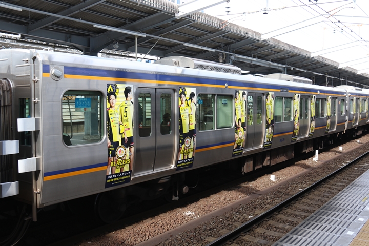 | 昨年10月7日(月)から本年5月31日(土)まで8311Fに堺ブレイザーズとコラボした「堺ブレイザーズトレイン」が運行されています。1月19日(日)、"2200系復元デザイン車両お披露目会"へ行った帰り、堺駅3番線に堺ブレイザーズトレインが停車していたので撮影してきました。まずは難波方から山手のラッピングを撮影。なお和歌山市方4両目の8411車には女性専用車両ステッカーが貼られているためラッピングはありません。 |