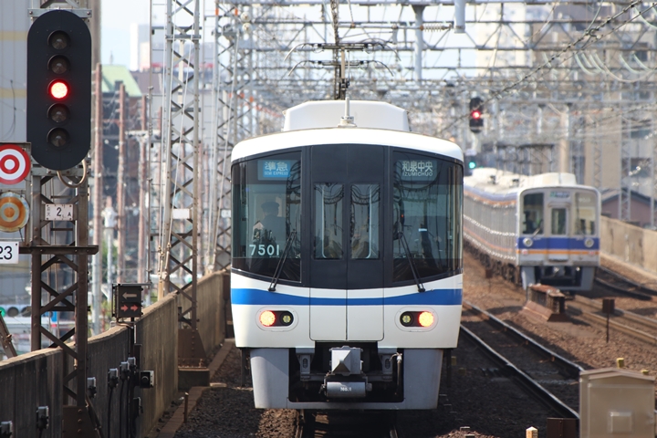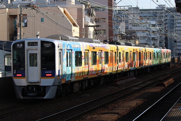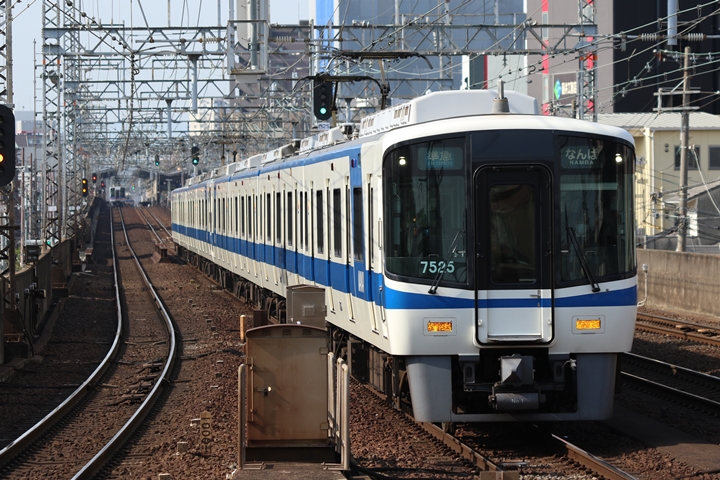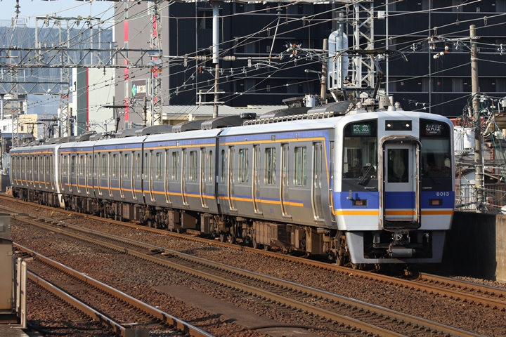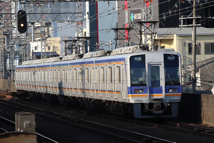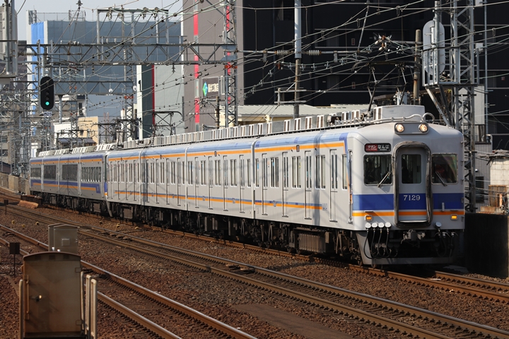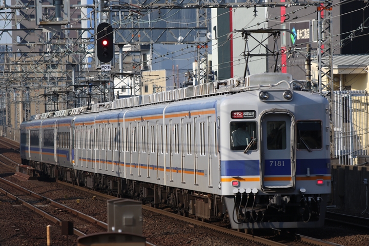 | 続いて3rd CHAPTERでは天下茶屋駅7時20分発高野線特急泉北ライナーなんば行き、天下茶屋駅7時24分発南海線空港急行なんば行きの画像から御紹介します。当CHAPTERの注目は今のウチに撮りためしておきたい7100系、朝日に照らされながら6連がやって来ました。 |