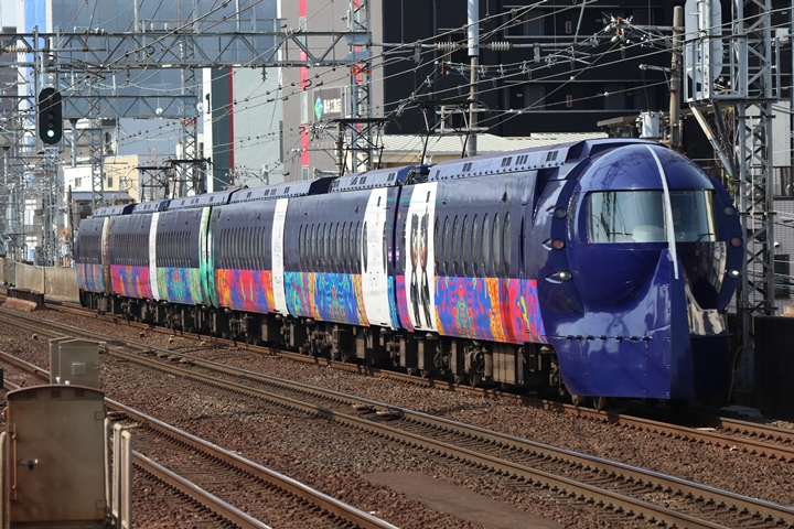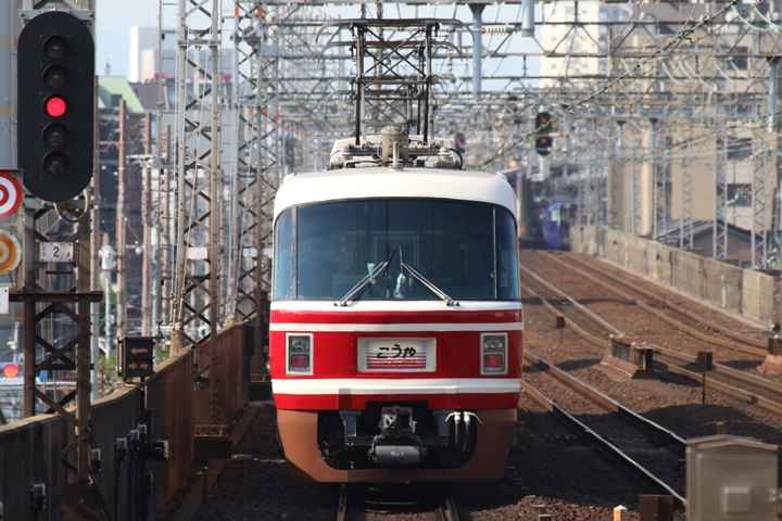 | 続いて5th CHAPTERでは新今宮駅8時4分発南海線回送車、萩ノ茶屋駅8時9分発高野線特急泉北ライナーなんば行きの画像から御紹介します。当CHAPTERの注目は創業140周年ヘッドマークを掲出した7100系復元デザイン車両、「お銀」に続いて二本目を捕獲できました。 |