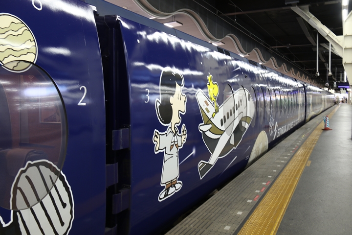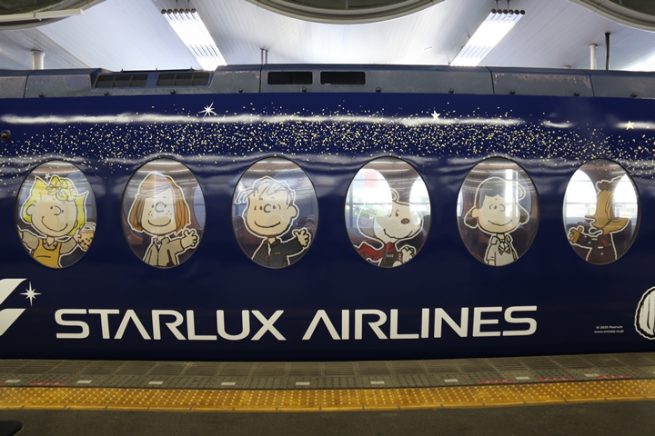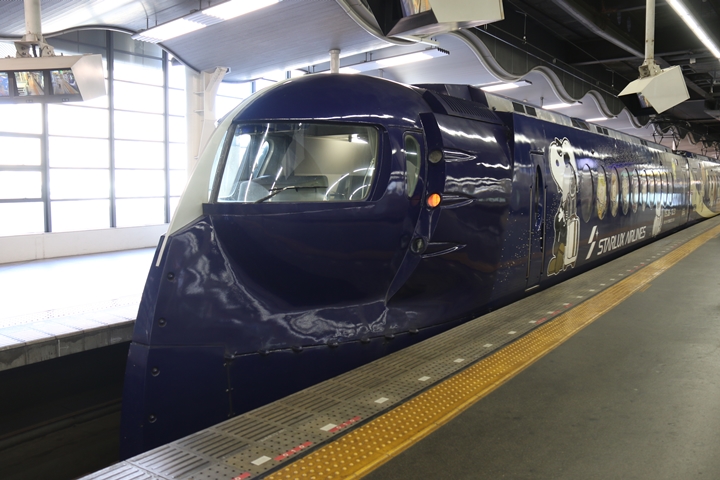 | 本年6月29日(日)より台湾桃園国際空港を拠点とするスターラックス航空が「PEANUTS×STARLUX」プロモーションの一環として「PEANUTS×STARLUX ラッピングラピート」を運行開始しました。ちなみにラッピングは第3編成(50503F)に施されています。6時50分、ラピートがやって来ました。 |