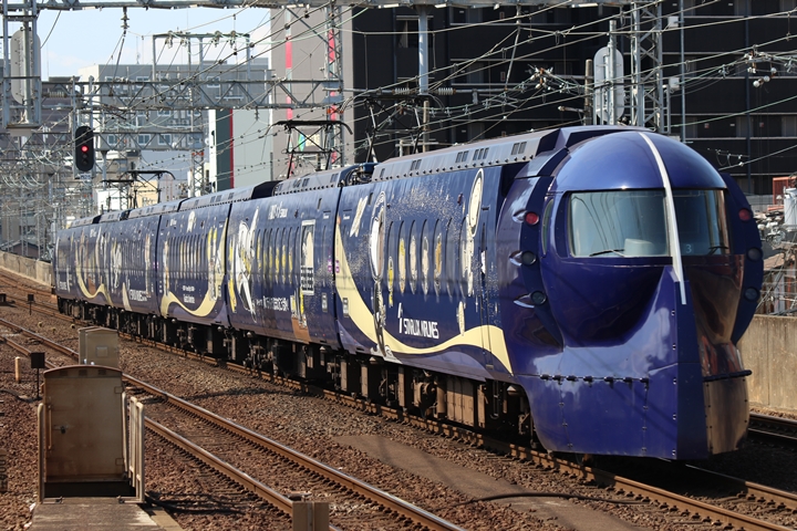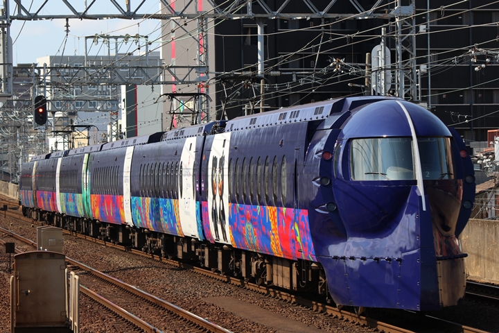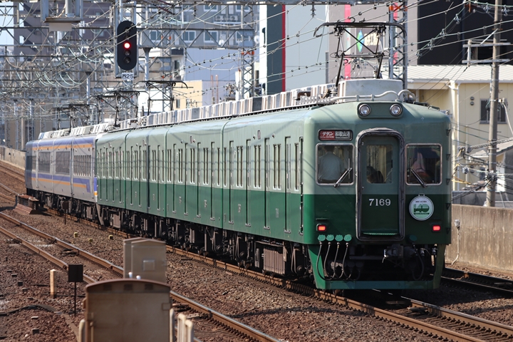 | 続いて9th CHAPTERでは新今宮駅8時41分発高野線区間急行和泉中央行き、天下茶屋駅8時42分発南海線特急ラピートなんば行きの画像から御紹介します。当CHAPTERの注目は創業140周年ヘッドマークを掲出した7100系復元デザイン車両、なぜか10000系復元デザイン車両との連結は滅多に見れないのです。 |