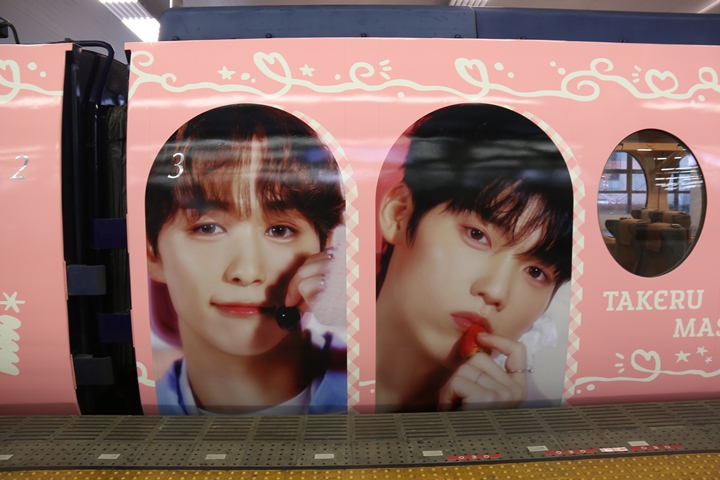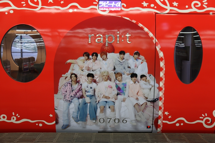 | 本年10月14日(火)よりグローバルボーイズグループ「INI」のWINTER SINGLE「THE WINTER MAGIC」とのコラボラッピングを施した「マジラピ号」を運行開始しました。ちなみにラッピングは第6編成(50506F)に施されています。私は10月25日(土)、"南海電車まつり2025"へ行く朝、難波駅で待ち構えているとやって来ました。 |