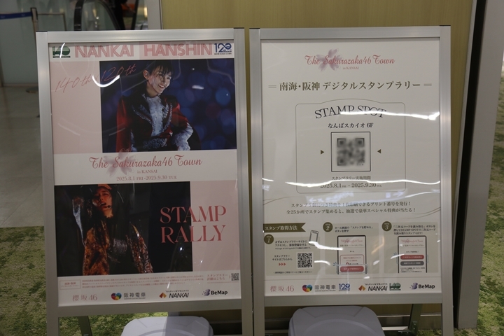 | 本年8月2日(土)、私は8月1日(金)から9月30日(火)まで南海と阪神で行われた「THE SAKURAZAKA46 TOWN in KANSAI デジタルスタンプラリー(以下「櫻坂46スタンプラリー」と省略)」に参加してきました。全25ヶ所を巡るスタンプラリー、そして同時に「戦国武将クイズ&スタンプラリー」にも参加してきました。私は【Vの字】コースで巡る事にしました。まずは関西空港駅へ向かい1つ目・2つ目のスタンプをゲット。なおQRコードにはモザイクを施しています。 |